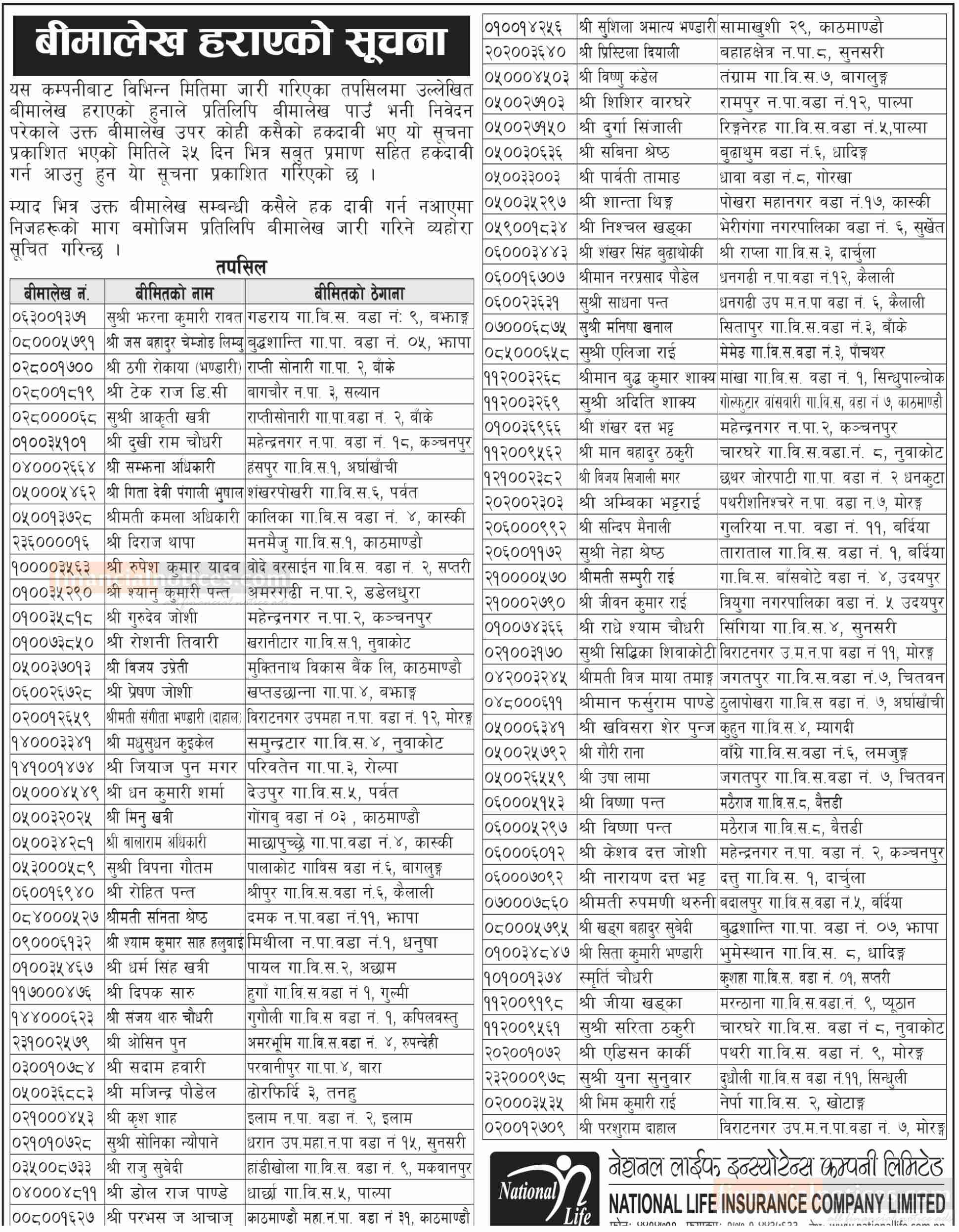 बीमालेख हराएको सम्बन्धी सूचना