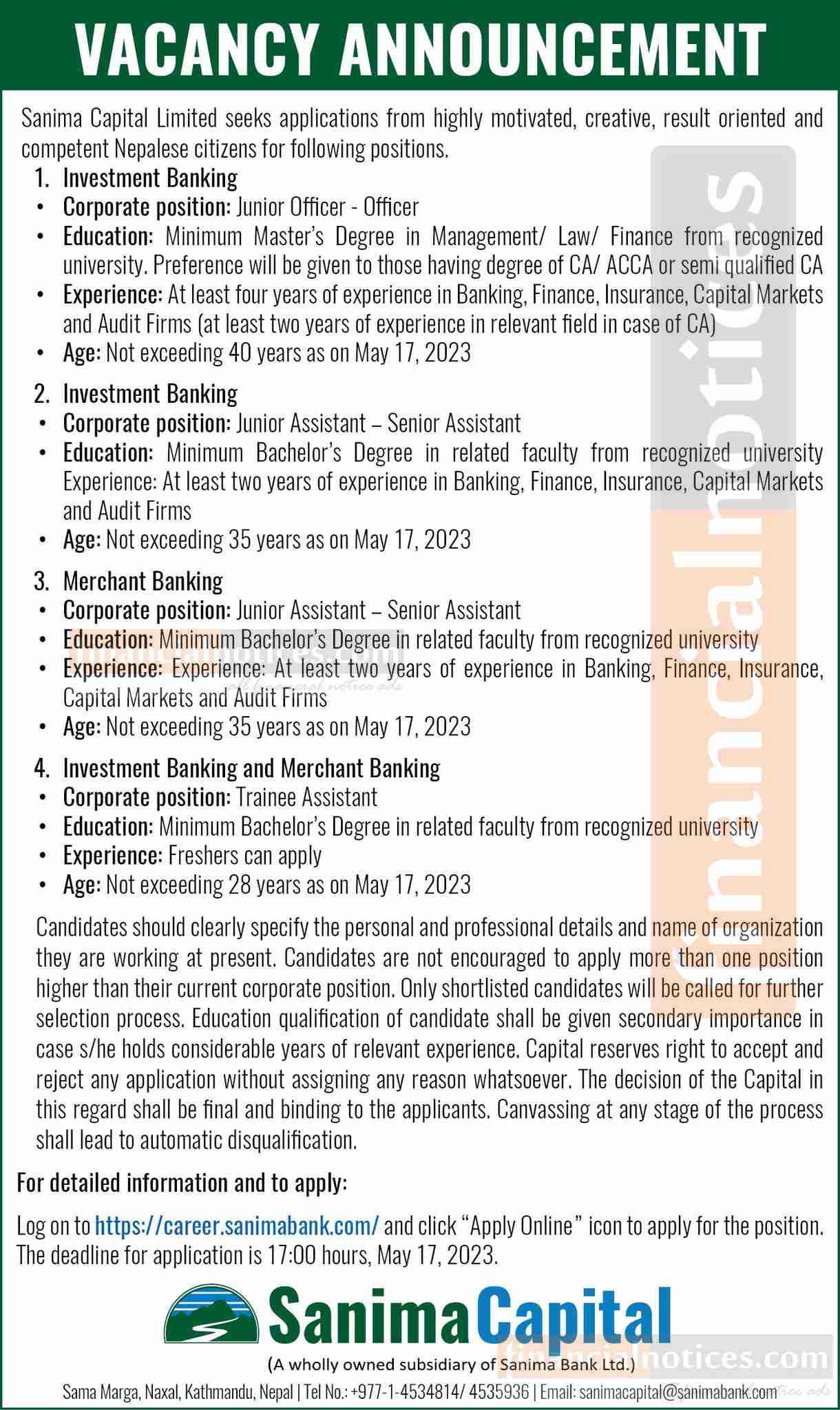 Sanima Capital Limited, a leading investment and merchant banking company in Nepal, has invited applications from highly motivated, creative, result-oriented, and competent Nepalese citizens for the Investment Banking and Merchant Banking departments.