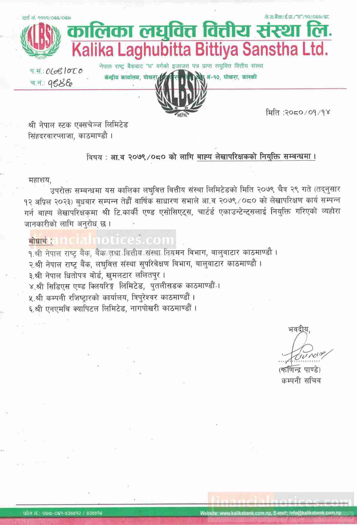 कालिका लघुवित्तको बाह्य लेखापरिक्षक नियुक्ति बारे सूचना