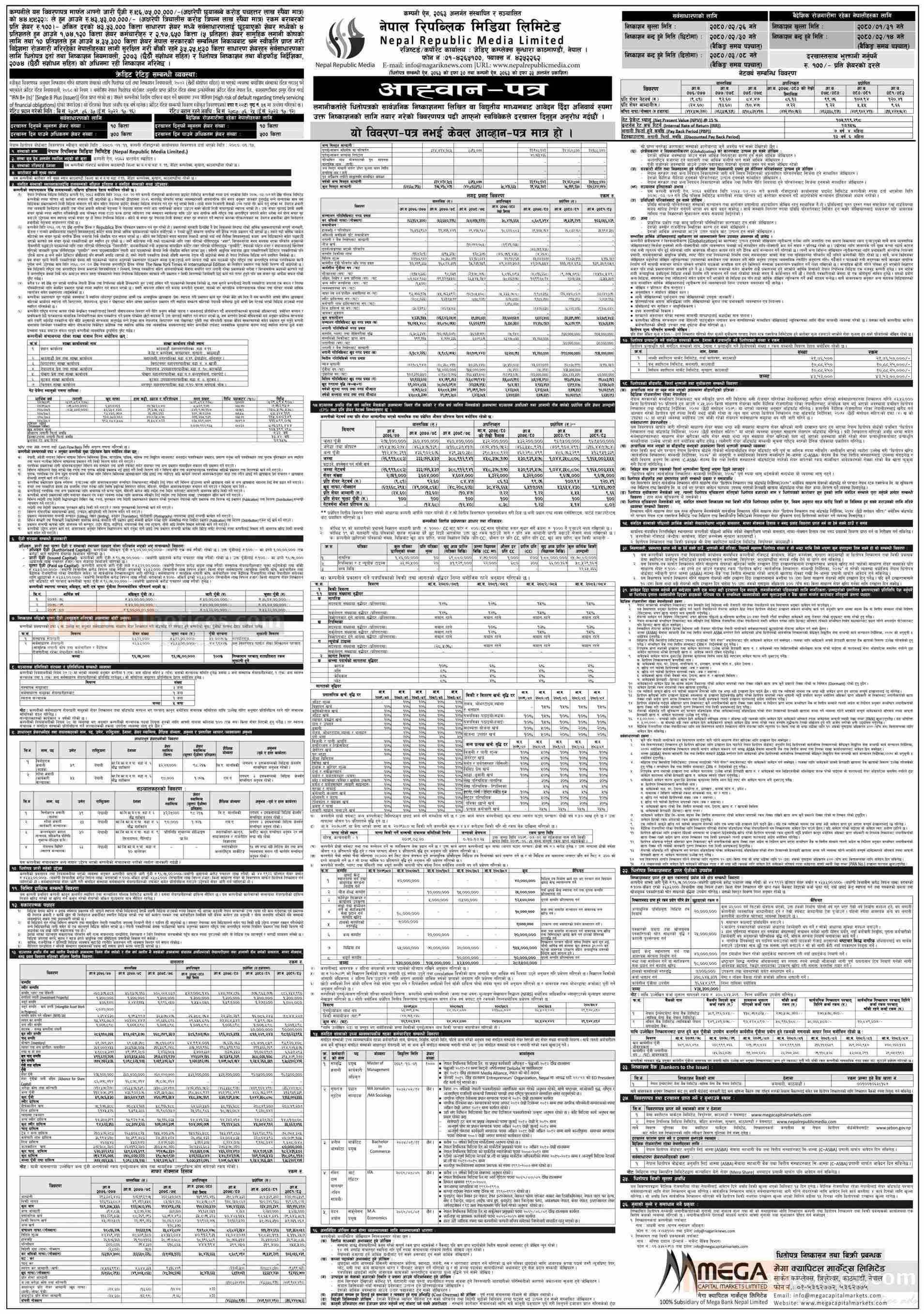 नेपाल रिपब्लिक मिडियाले आफ्नो जारी पूँजी ९६ करोड ७५ लाख रुपैयाँको ४४.९९२२ प्रतिशत अर्थात ४३ करोड ५३ लाख रुपैयाँ बराबरको प्रतिकित्ता १०० रुपैयाँ अंकित मूल्यका ४३ लाख ५३ हजार कित्ता शेयर निष्काशन निष्काशन गर्ने सूचनामा उल्लेख गरेको छ। जसमा ४ प्रतिशतले हुन आउने १ लाख ७४ हजार १२० कित्ता शेयर कर्मचारीहरुका लागि र ५ प्रतिशतले हुन आउने २ लाख १७ हजार ६५० कित्ता शेयर सामूहिक लगानी कोषहरुका लागि छुट्याइएको छ। कम्पनीले नेपाल सरकारको सम्बन्धित निकायबाट श्रम स्वीकृति प्राप्त गरी विदेशमा रोजगारी गरिरहेका नेपालीहरुका लागि ४ लाख ३५ हजार ३०० कित्ता शेयर निष्काशन गर्नेछ। सर्वसाधारण लगानीकर्ताले बाँकी रहेको ३५ लाख २५ हजार ९३० कित्ता शेयरका लागि आवेदन दिन सक्ने जनाएको छ ।