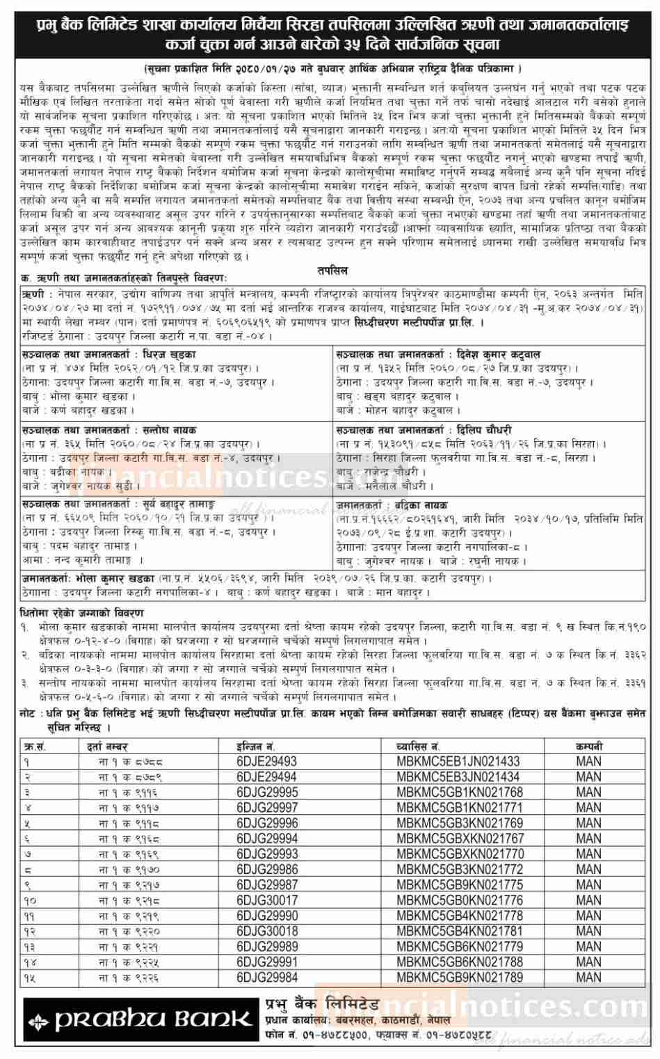 प्रभु बैंकका ऋणी तथा जमानतकर्तालाई कर्जा चुक्ता गर्न आउने बारे ३५ दिने सूचना