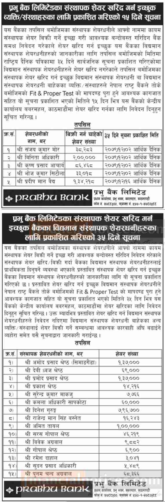 प्रभु बैंकको संस्थापक शेयरधनीहरुलाई जरुरी सूचना