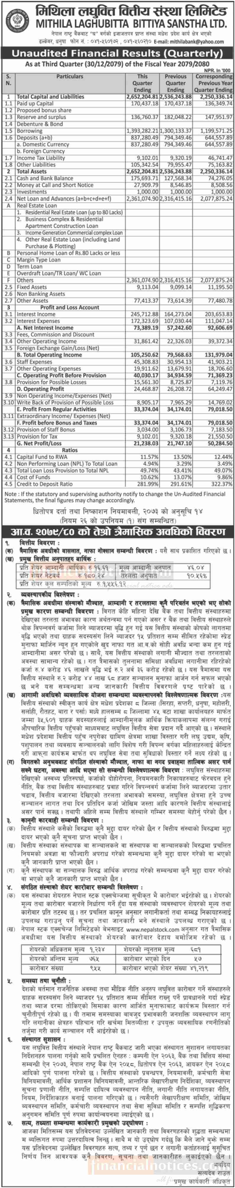 मिथिला लघुवित्तको खुद नाफा २ करोड १२ लाख रुपैयाँ - Q3 Report