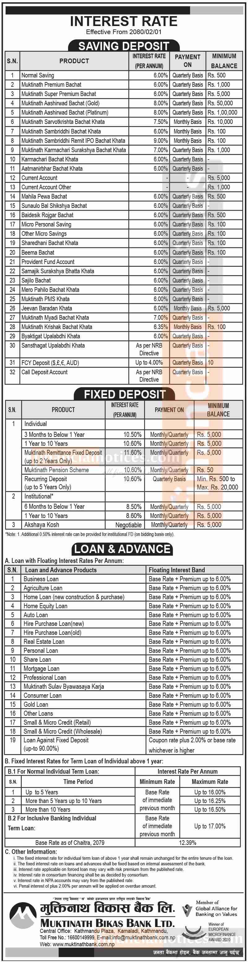 मुक्तिनाथ विकास बैंकको ब्याजदर परिवर्तनको सूचना - New Interest Rates -