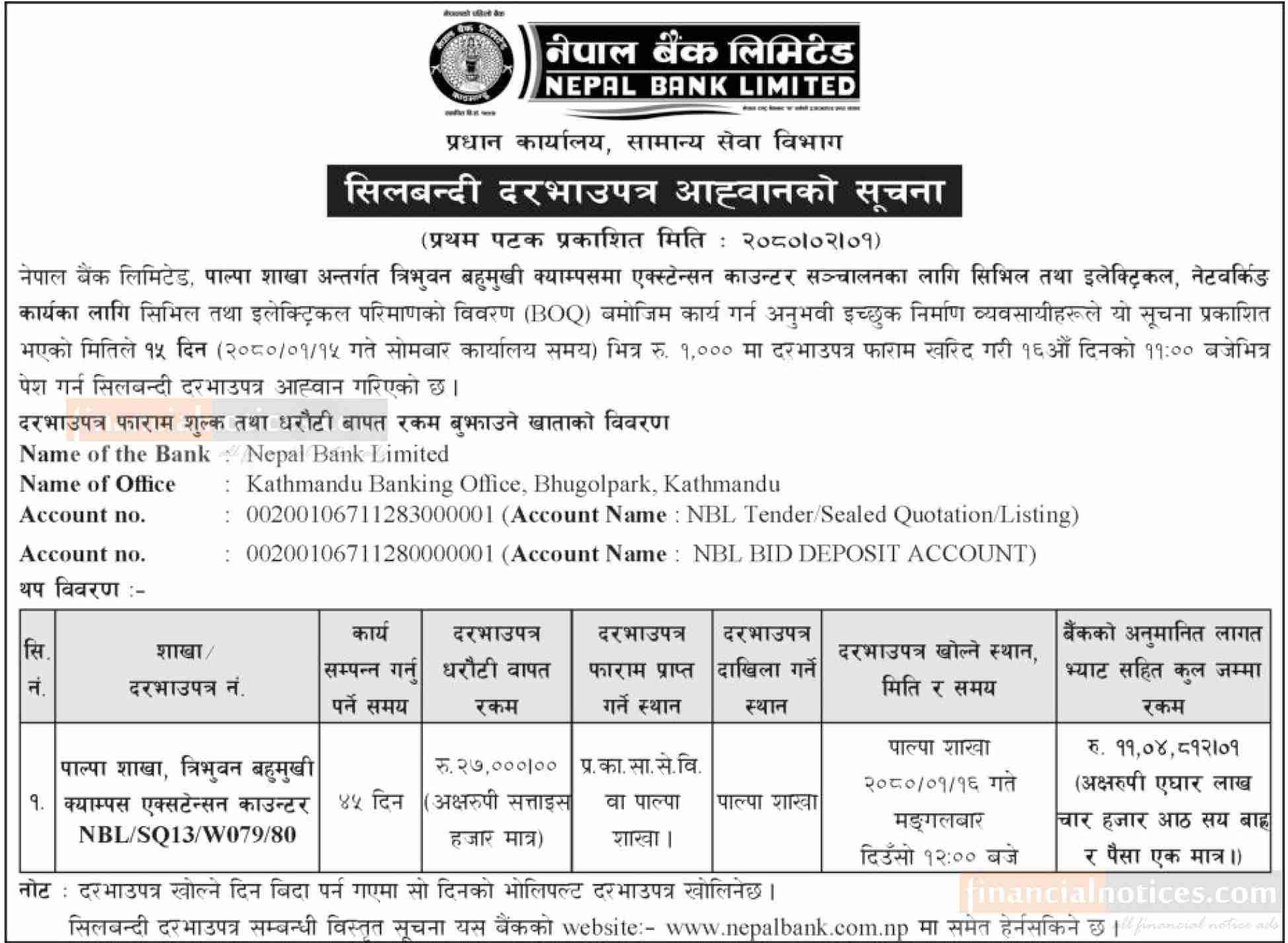 नेपाल बैंकको शिलबन्दी दरभाउपत्र आव्हानको सूचना