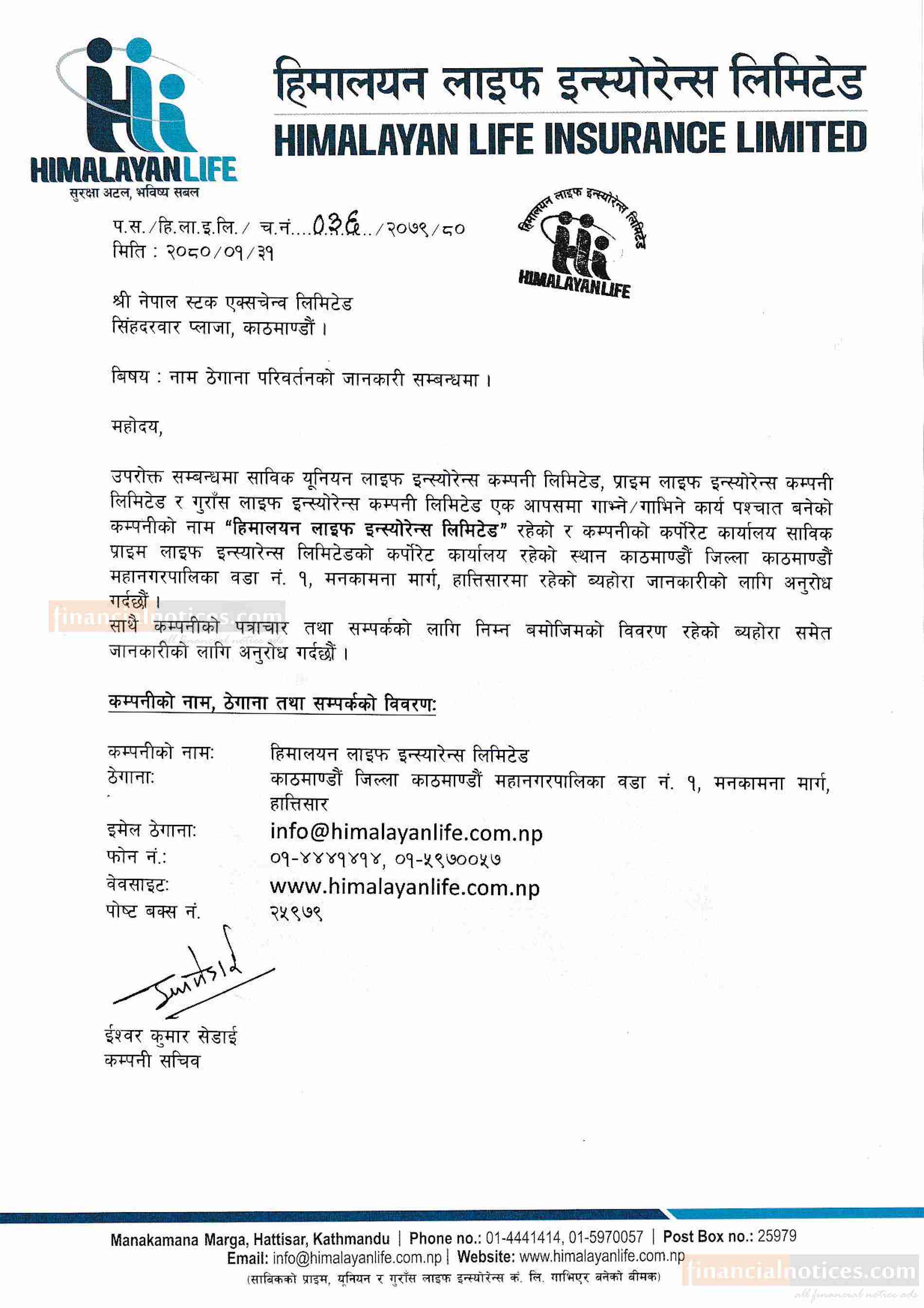 हिमालयन लाइफ इन्स्योरेन्सको नाम ठेगाना परिवर्तनको सूचना