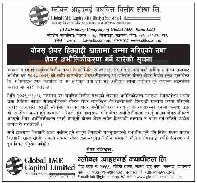 बोनस शेयर हितग्राही खतामा जम्मा गरिएकोबारे सूचना