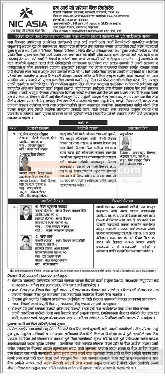 धितोमा रहेको चल अचल सम्पत्ति लिलामी विक्रिकवो सूचना