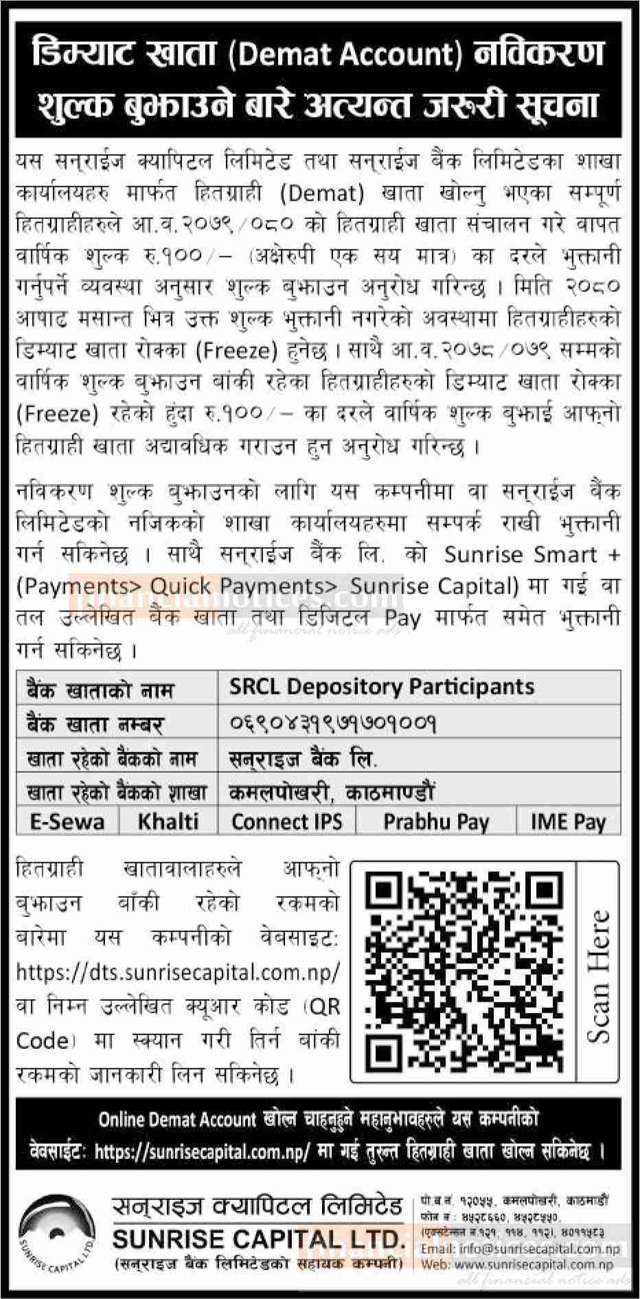 डिम्याट खाता नविकरण शुल्क बुझाउने सम्बन्धी सूचना