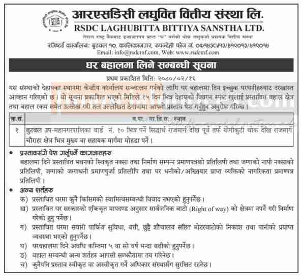 लघुवित्तको लागि घर बहालमा लिने सम्बन्धी सूचना