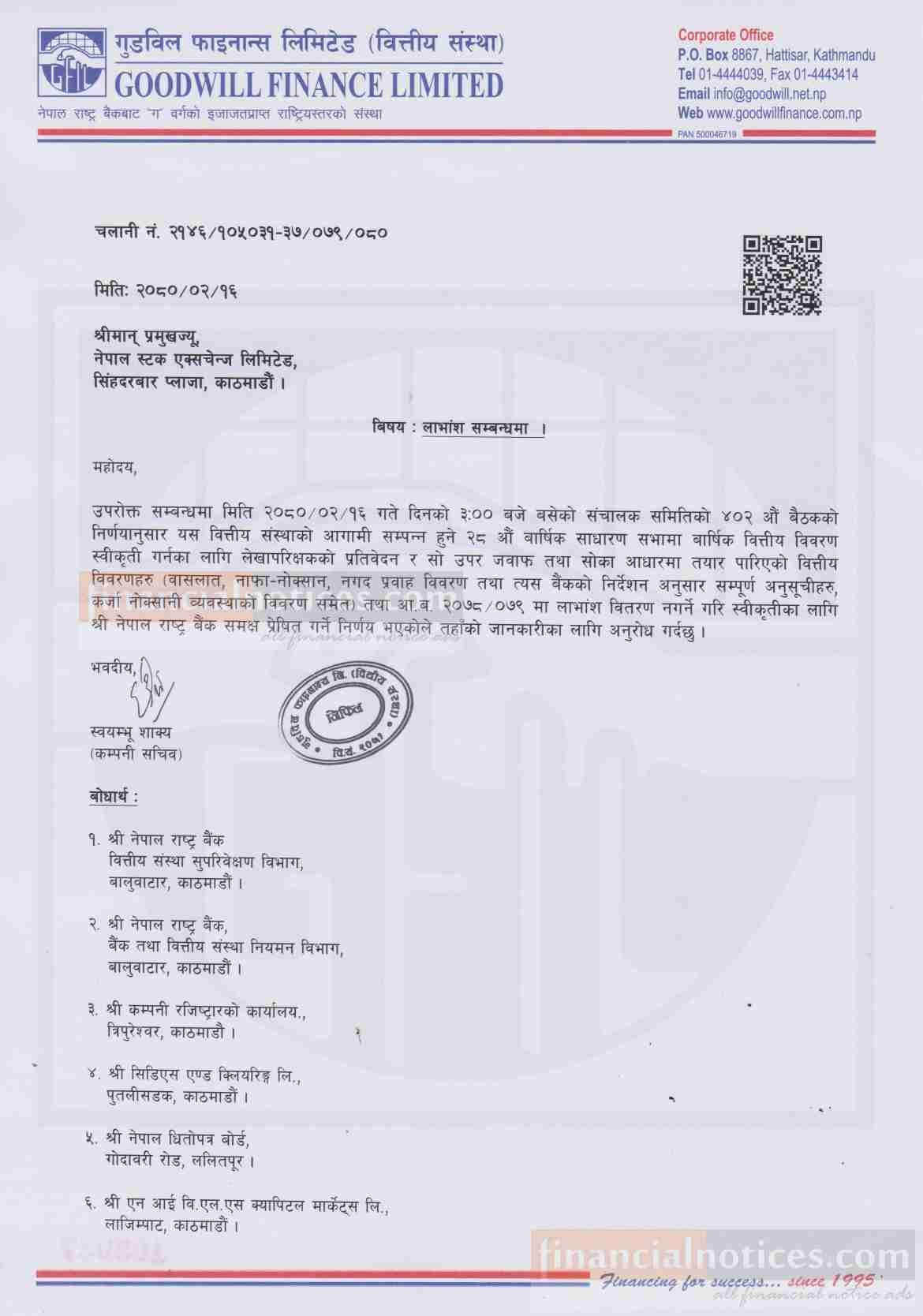 गुडविल फाइनान्सले यस वर्ष लाभांश नदिने बारे सूचना