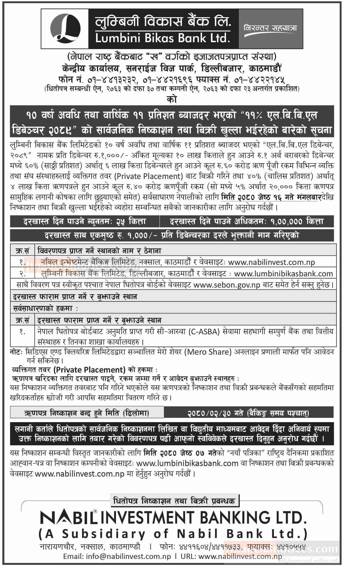 लुम्बिनी विकास बैंकको ऋणपत्रमा आवेदन दिने म्याद थप गरिएको सम्बन्धी सूचना