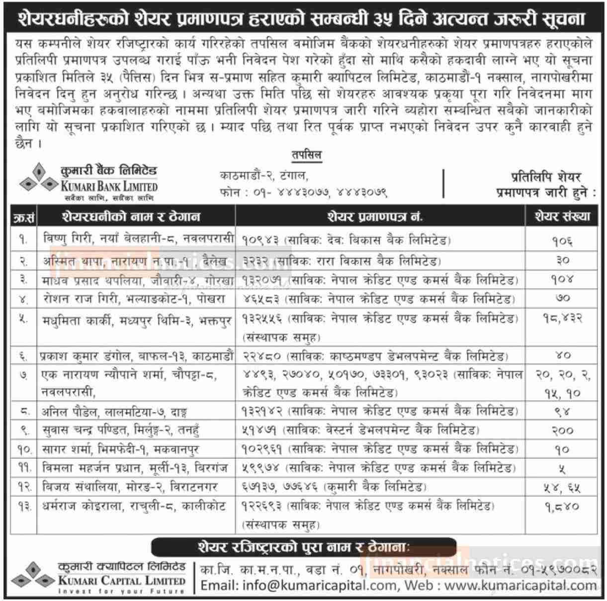 शेयरधनीहरुको शेयर प्रमाणपत्र हराएको सम्बन्धी ३५ दिने सूचना