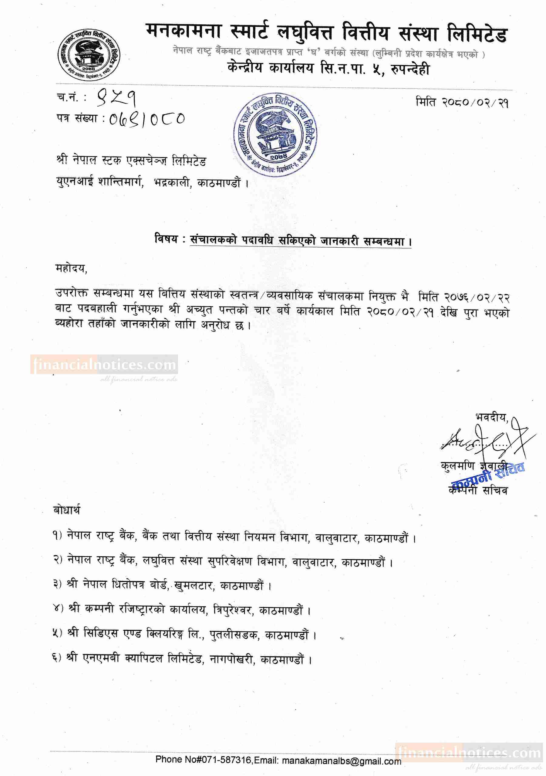 मनकामना स्मार्ट लघुवित्तको संचालकको पदावधि सकिएको सम्बन्धी सूचना