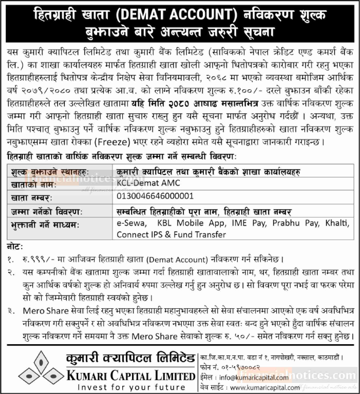 डिम्याट् खाता नविकरण शुल्क बुझाउनेबारे कुमारी क्यापिटलको सूचना