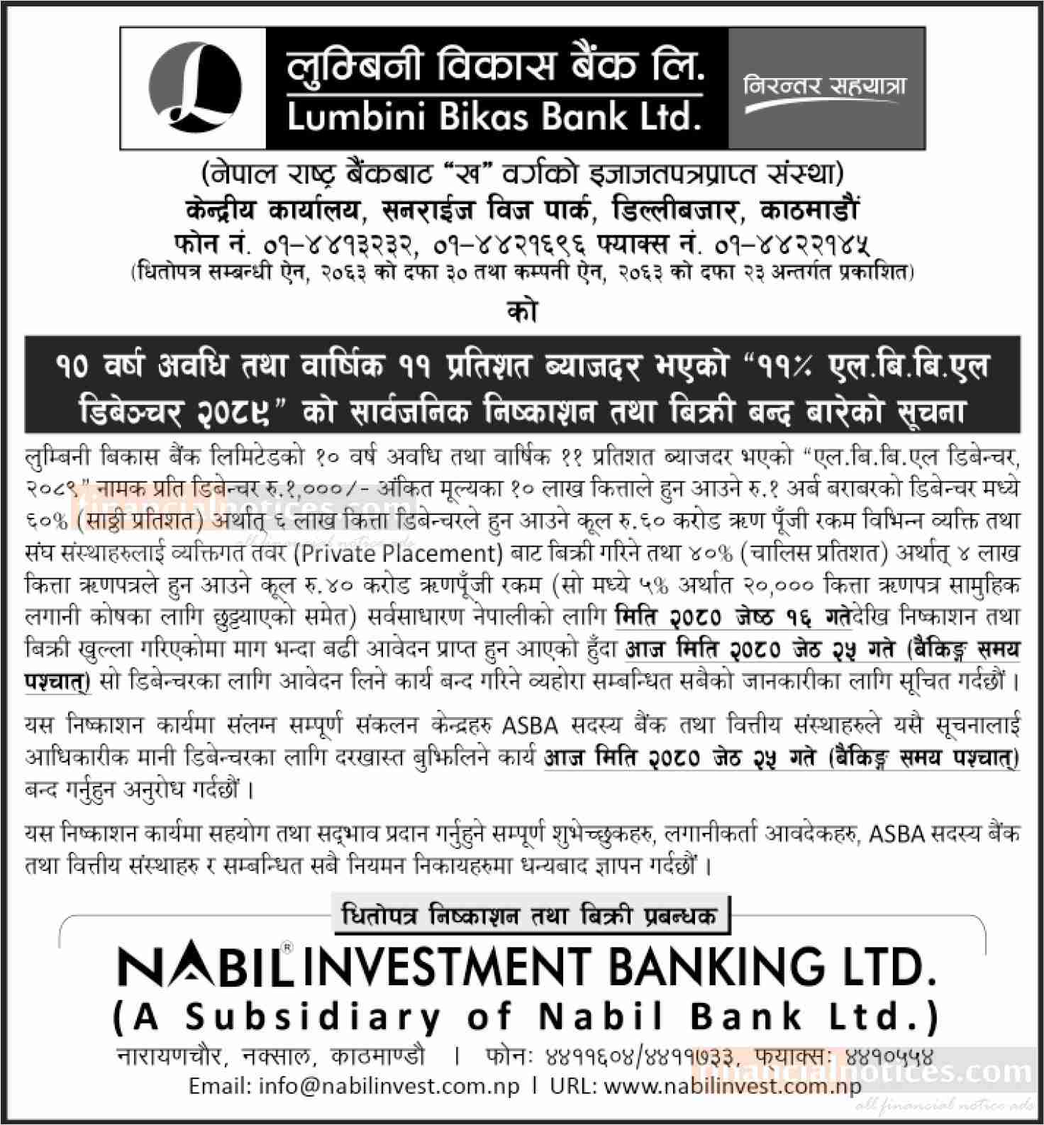 लुम्बिनी विकास बैंकले जेठ १६ गतेदेखि निष्काशन तथा बिक्री खुला गरेको ऋणपत्रमा आवेदन दिने आज अर्थात जेठ २५ गते अन्तिम दिन रहेको छ। बैंकले १० वर्ष अवधिको वार्षिक ११ प्रतिशत ब्याजदरमा ११ प्रतिशत एलबिबिएल डिबेन्चर २०८९ मा निष्काशन गरेको हो।