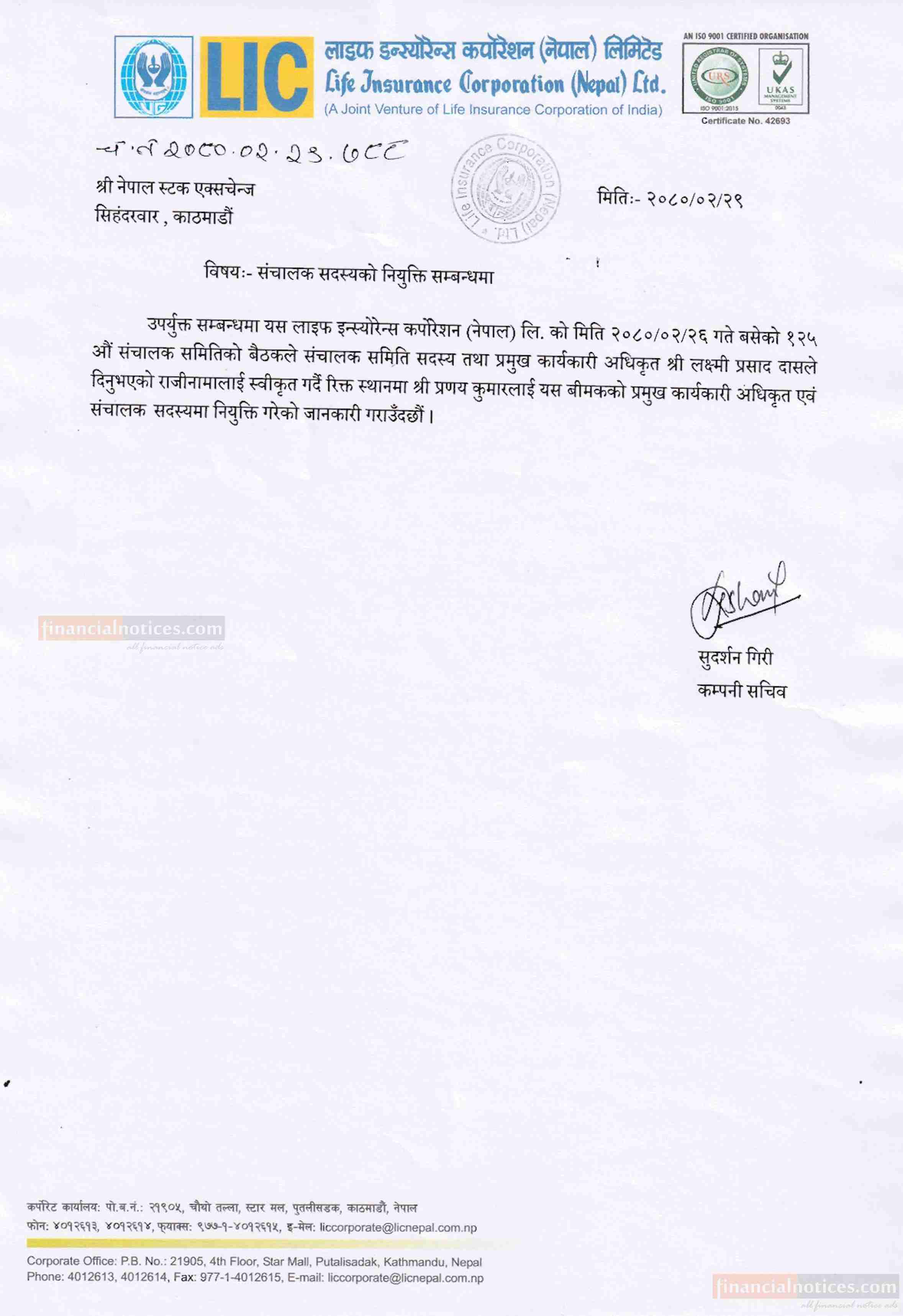 Appointment of Director of Life Insurance Corporation