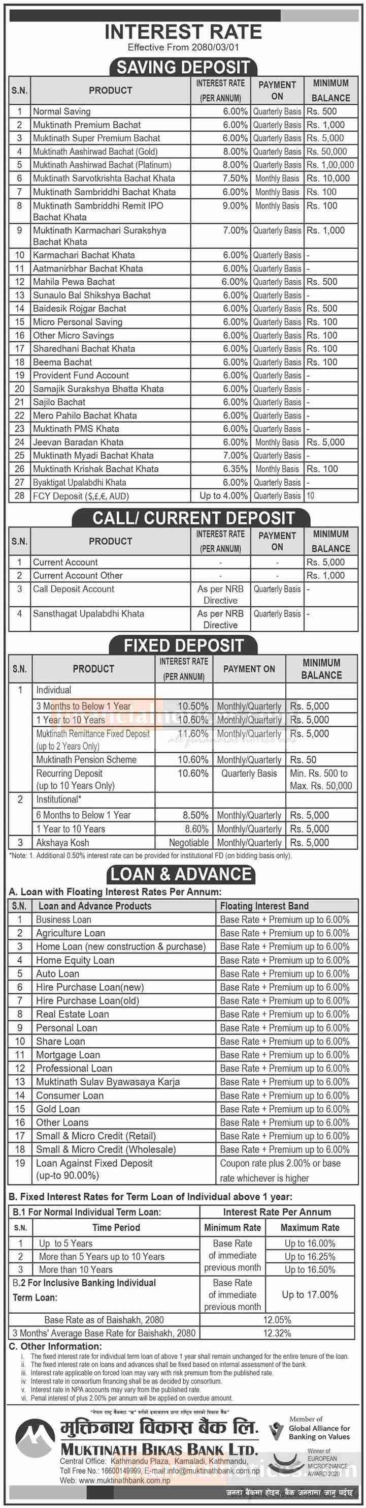 मुक्तिनाथ विकास बैंकको ब्याजदर परिवर्तनको सूचना - New Interest Rates -