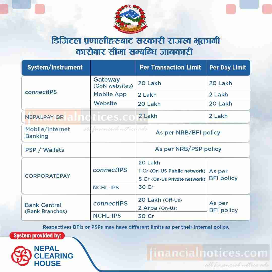 The Government of Nepal (GoN) has announced the introduction of several payment channels to facilitate revenue payments, offering citizens enhanced convenience and flexibility. The newly introduced channels include connectIPS via GoN websites, connectIPS Mobile App, connectIPS Website, CORPORATEPAY via connectIPS, CORPORATEPAY via NCHL-IPS, Bank Central (Bank Branches) with ConnectIPS, and Bank Central (Bank Branches) with NCHL-IPS. Each channel comes with its own transaction limits, enabling individuals and organizations to choose the most suitable option for their payment needs. These initiatives signify GoN's commitment to digital solutions and financial inclusion. Stay tuned for further updates on Nepal's evolving payment ecosystem.