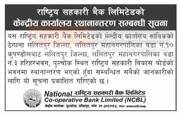 बैंकको केन्द्रीय कार्यालय स्थानान्तरण सम्बन्धी सूचना