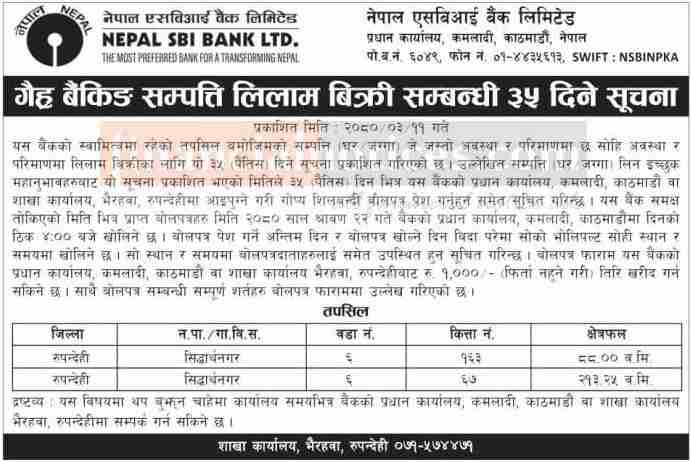 Nepal SBI Bank: Auction Notice for Non-Banking Assets at Geta-2, Kailali