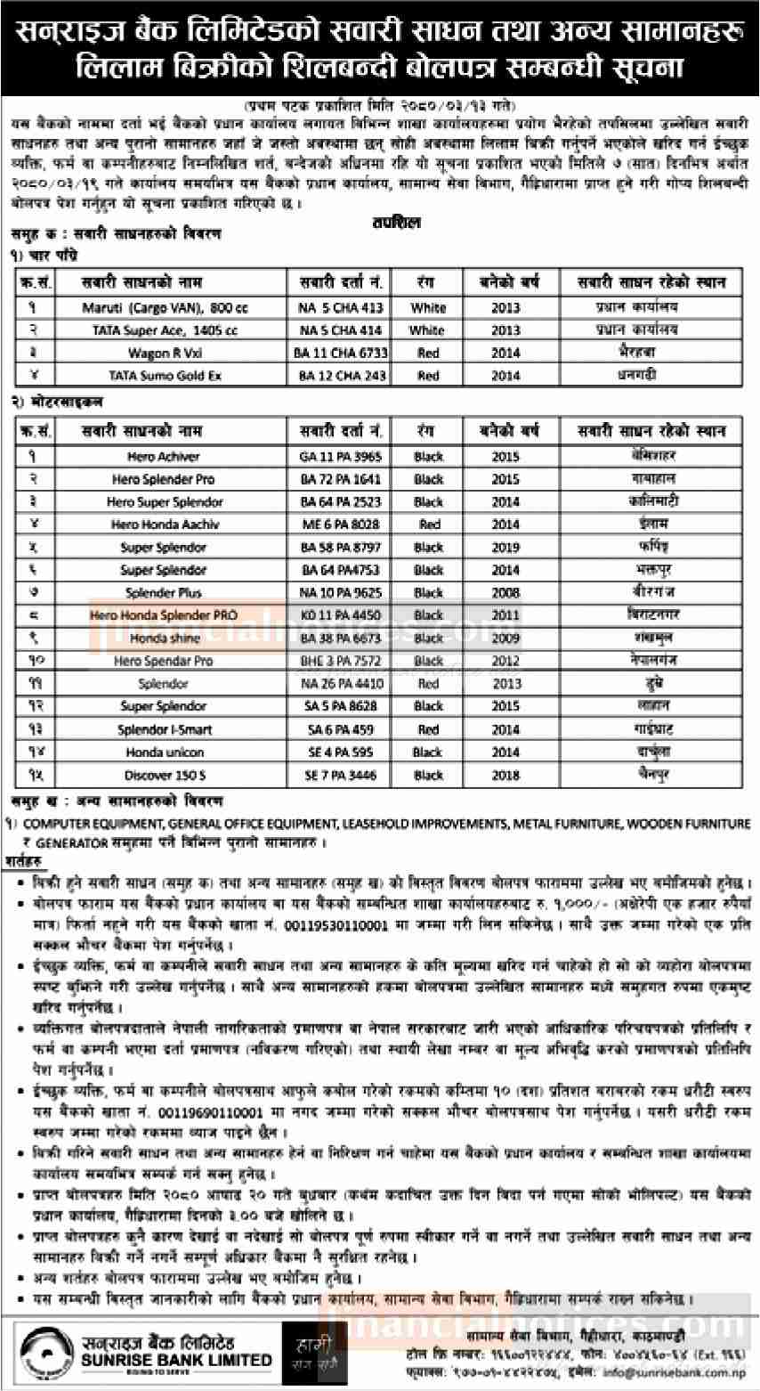 बैंकको सवारीसाधन शिलबन्दी बोलपत्र मार्फत बिक्रीको सूचना