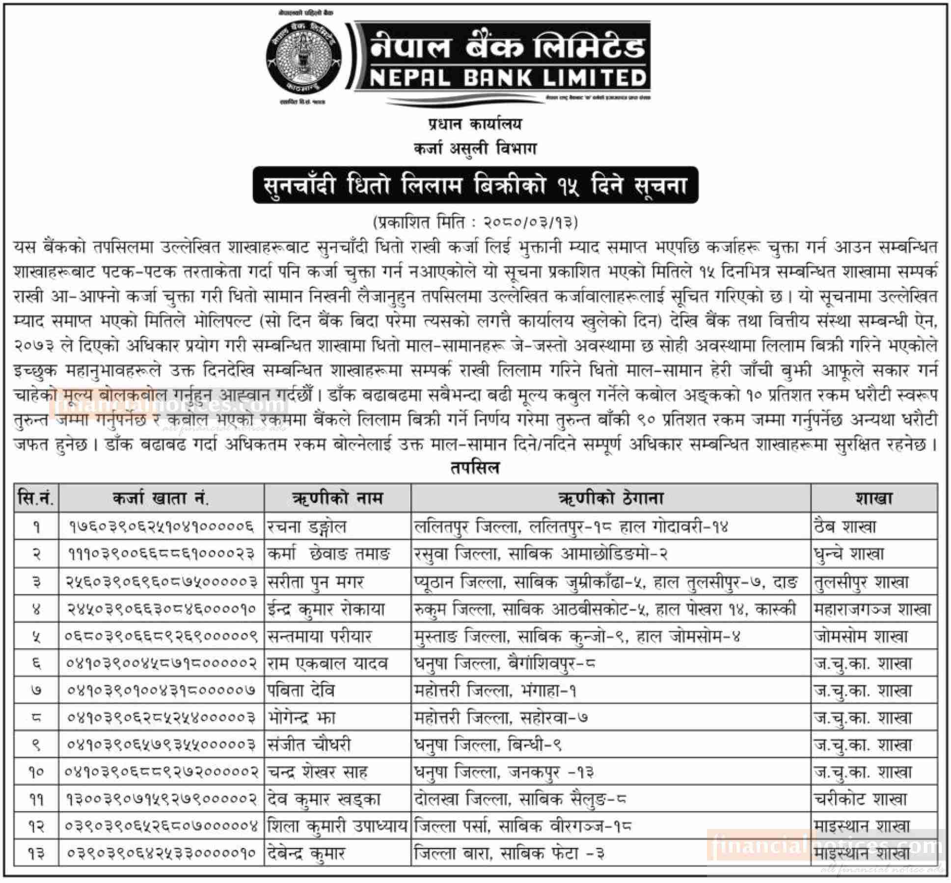 धितोमा रहेको सुनचाँदी लिलामी बिक्री सम्बन्धी नेपाल बैंकको १५ दिने सूचना