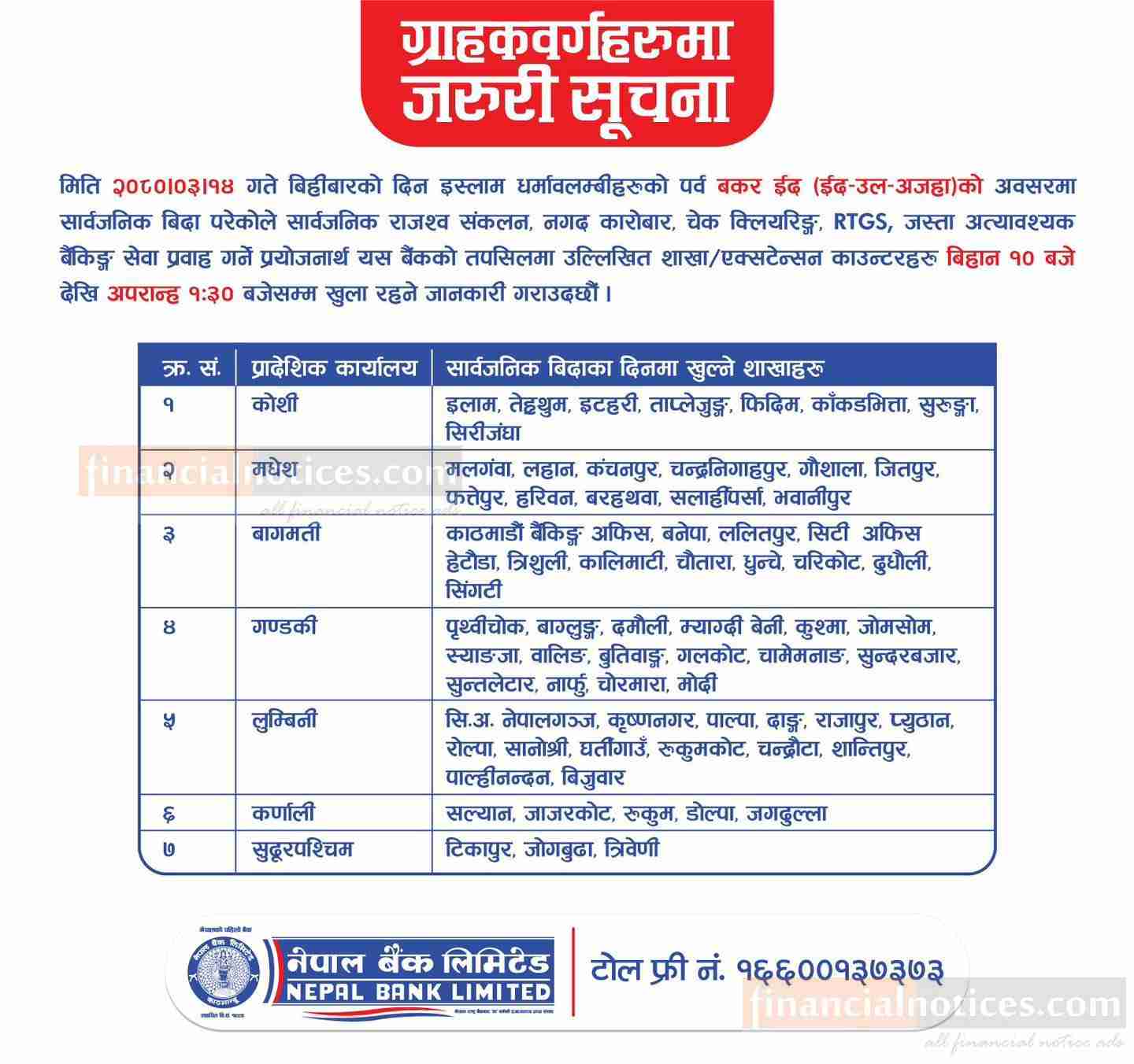 सार्वजनिक विदाको दिन नेपाल बैंकका कुन शाखा कतिबजेसम्म खुल्ला रहन्छ ?