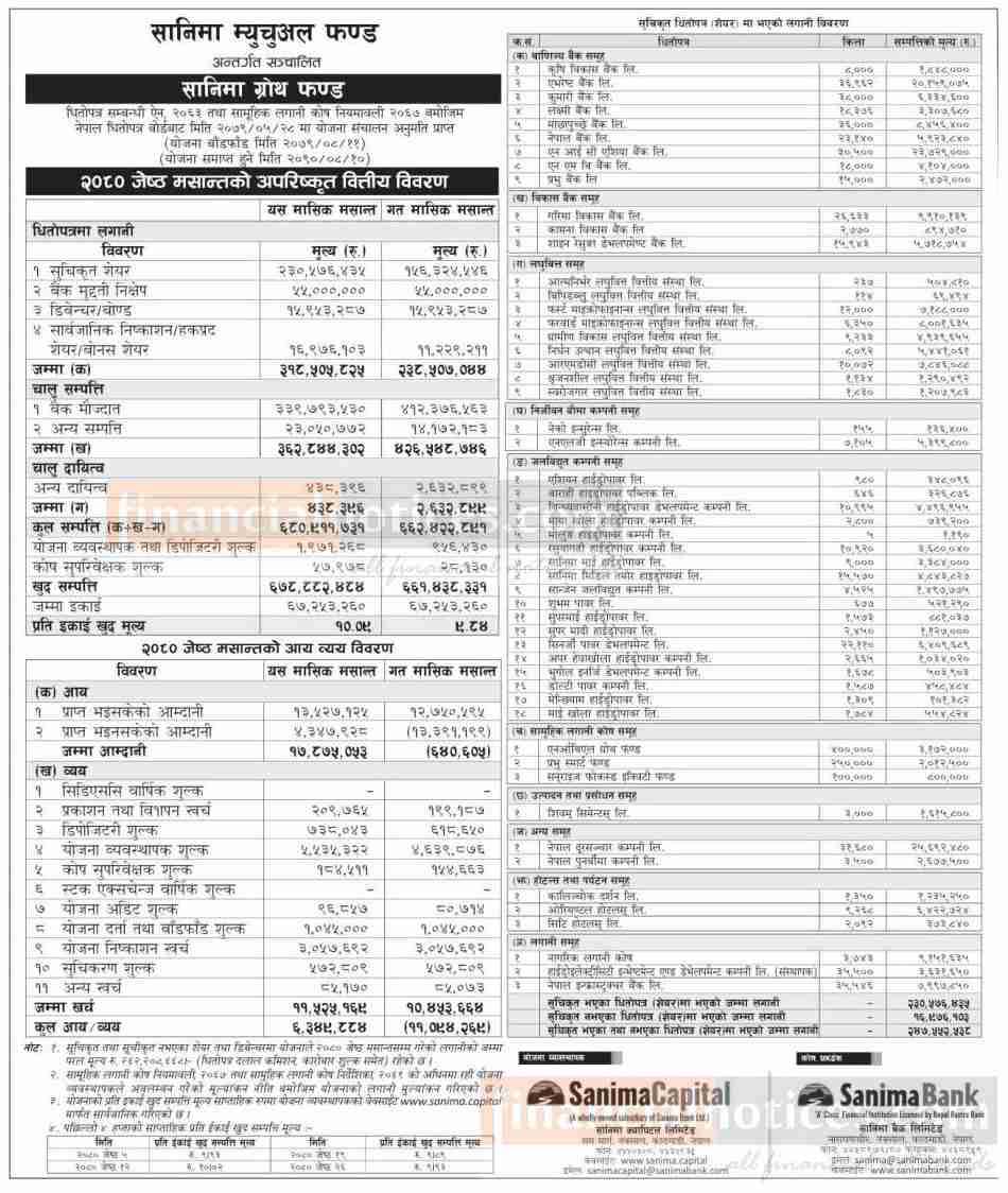Sanima Capital Releases Net Asset Value of 'Sanima Growth Fund' as of Jestha, 2080.