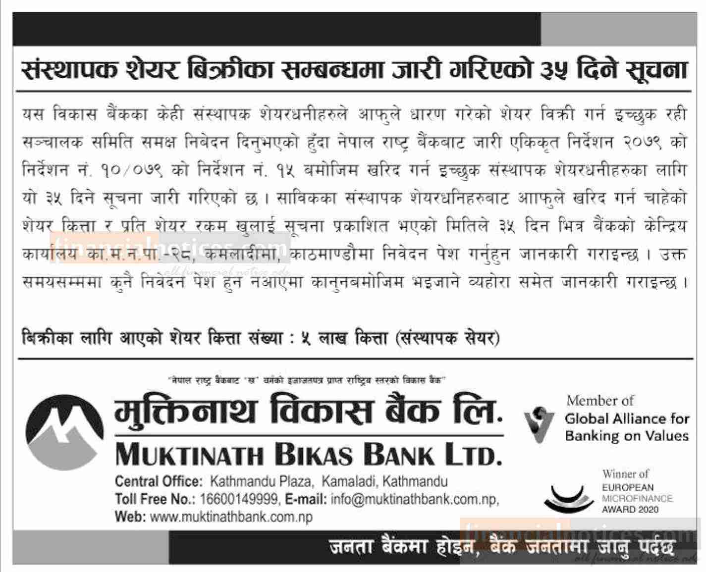 बैंकको संस्थापक शेयर बिक्रीका सम्बन्धमा जारी गरिएको ३५ दिने सूचना