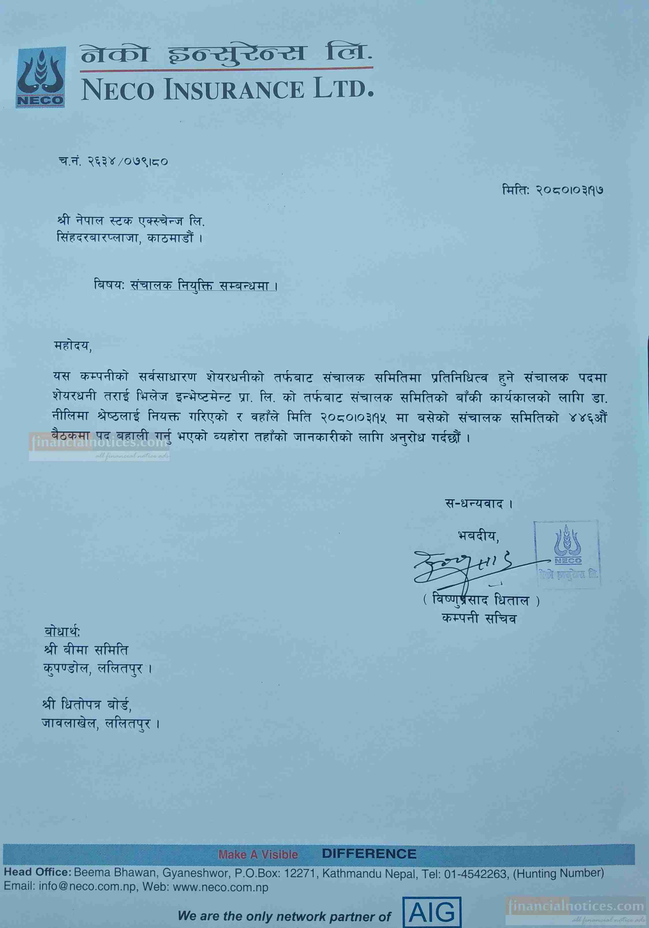 Notice Regarding Director Appoinment of NECO Insurance