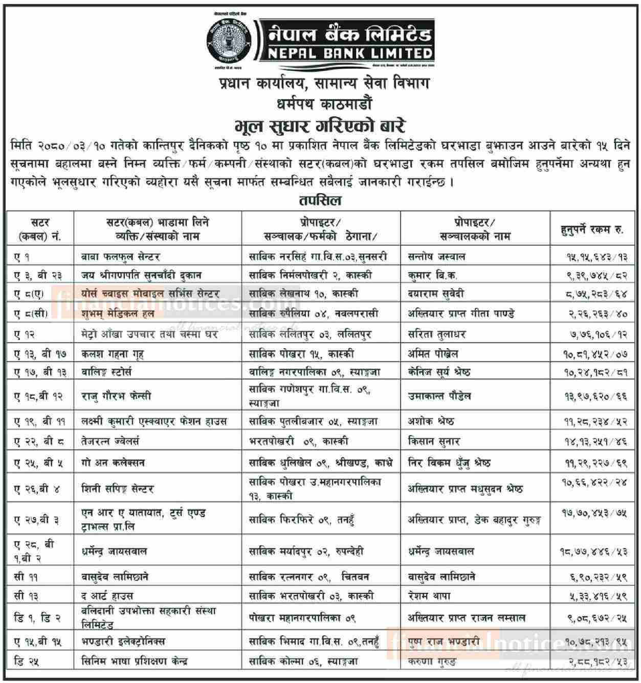 भुल सुधार गरिएको बारे नेपाल बैंकको सूचना