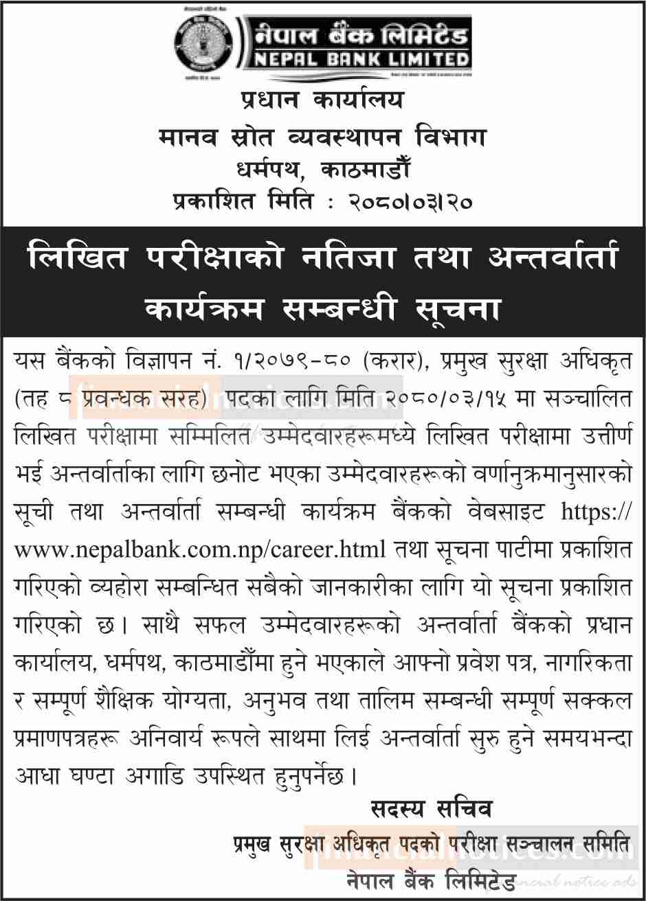 Written exam result and interview of Chief Security Officer (Ad-1/2079-80) Contract.