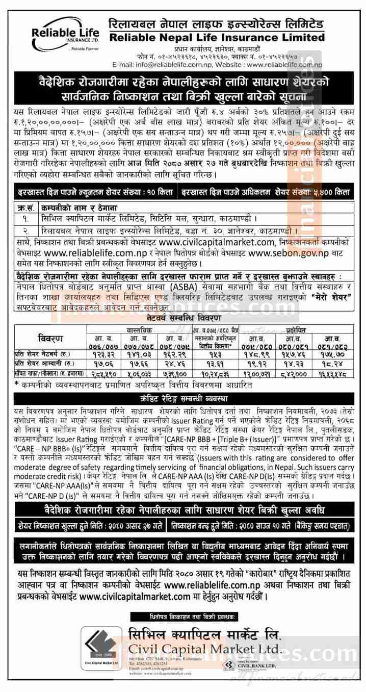 रिलायबल नेपाल लाइफको IPO बिक्री खुल्ला सम्बन्धी सूचना