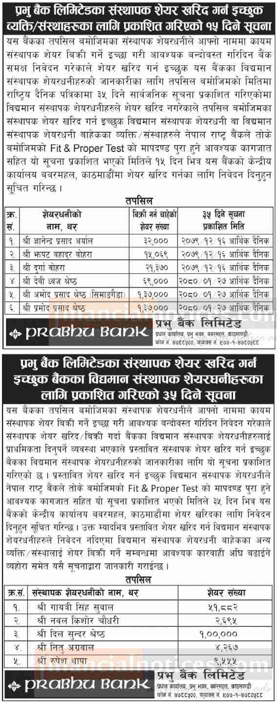 प्रभु बैंकको संस्थापक शेयरधनीहरुलाई अत्यन्त जरुरी सूचना