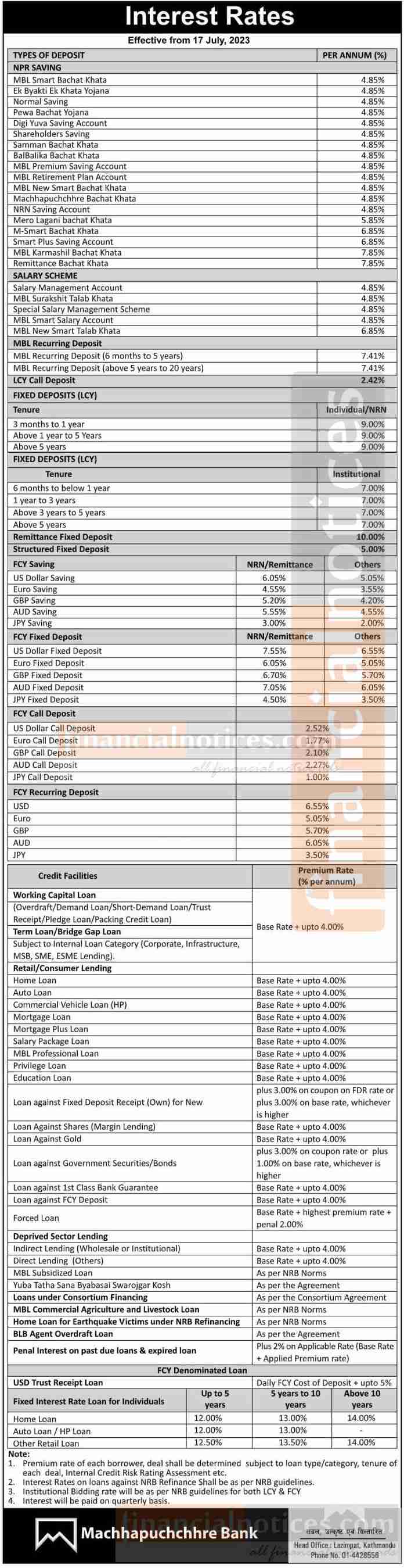 साउनदेखि लागु हुने गरी माछापुच्छ्रे बैंकले सार्वजनिक गर्यो नयाँ ब्याजदर तालिका - Interest Rates -