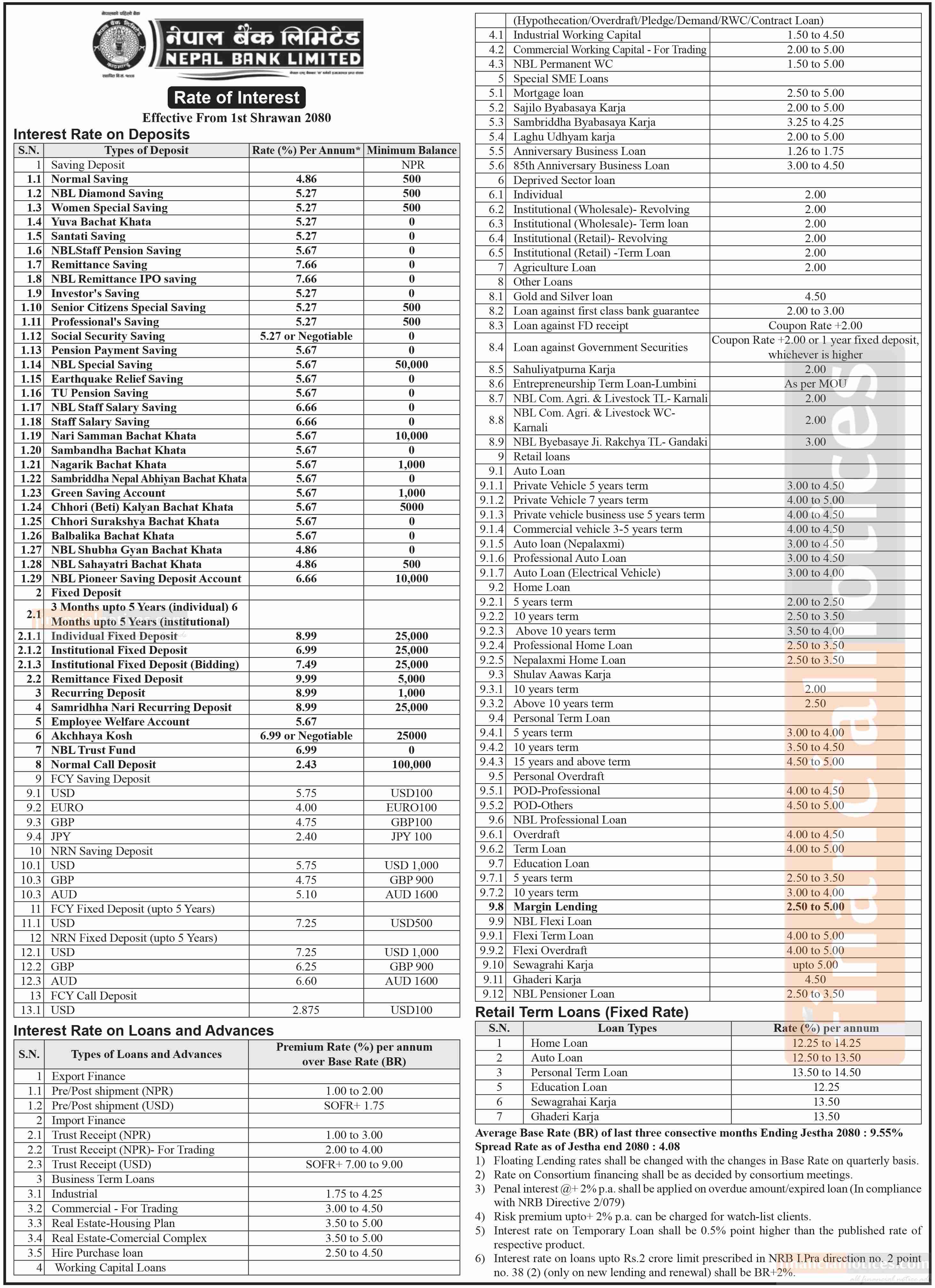 साउन १ गतेदेखि नेपाल बैंकको नयाँ ब्याजदर सार्वजानिक गरेकाे छ । केही खताहरूमा भने बैंकले ब्याजदर संशोधन गरी पुन साउन १ गते अर्को नयाँ सूचना पनि प्रकाशित गरेको छ ।