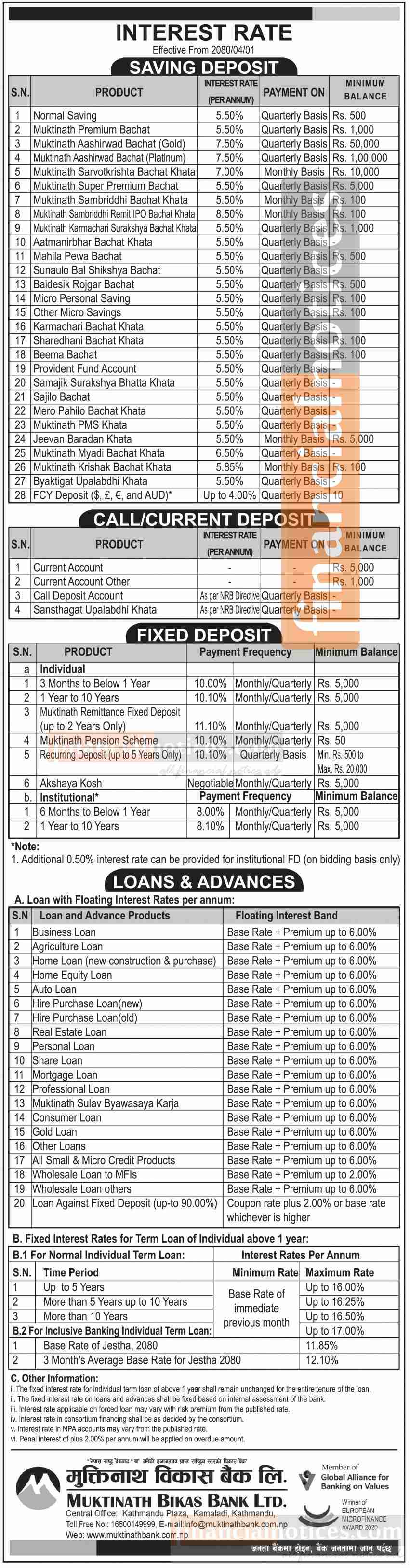 मुक्तिनाथ विकास बैंकको ब्याजदर परिवर्तनको सूचना - New Interest Rates -