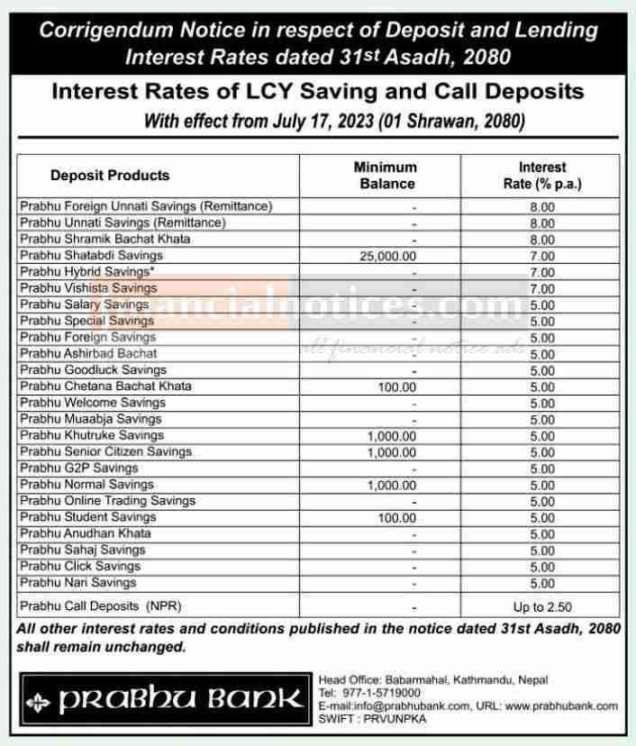 प्रभु बैंकको ब्याजदर संशोधन सम्बन्धी सूचना - Interest Rates Corrigendum Notice-