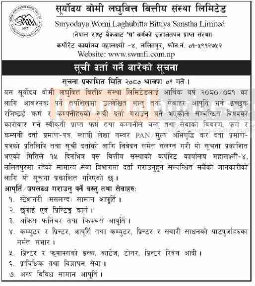 सूर्योदय वोमी लघुवित्तको सूची दर्ता गर्ने बारेको सूचना