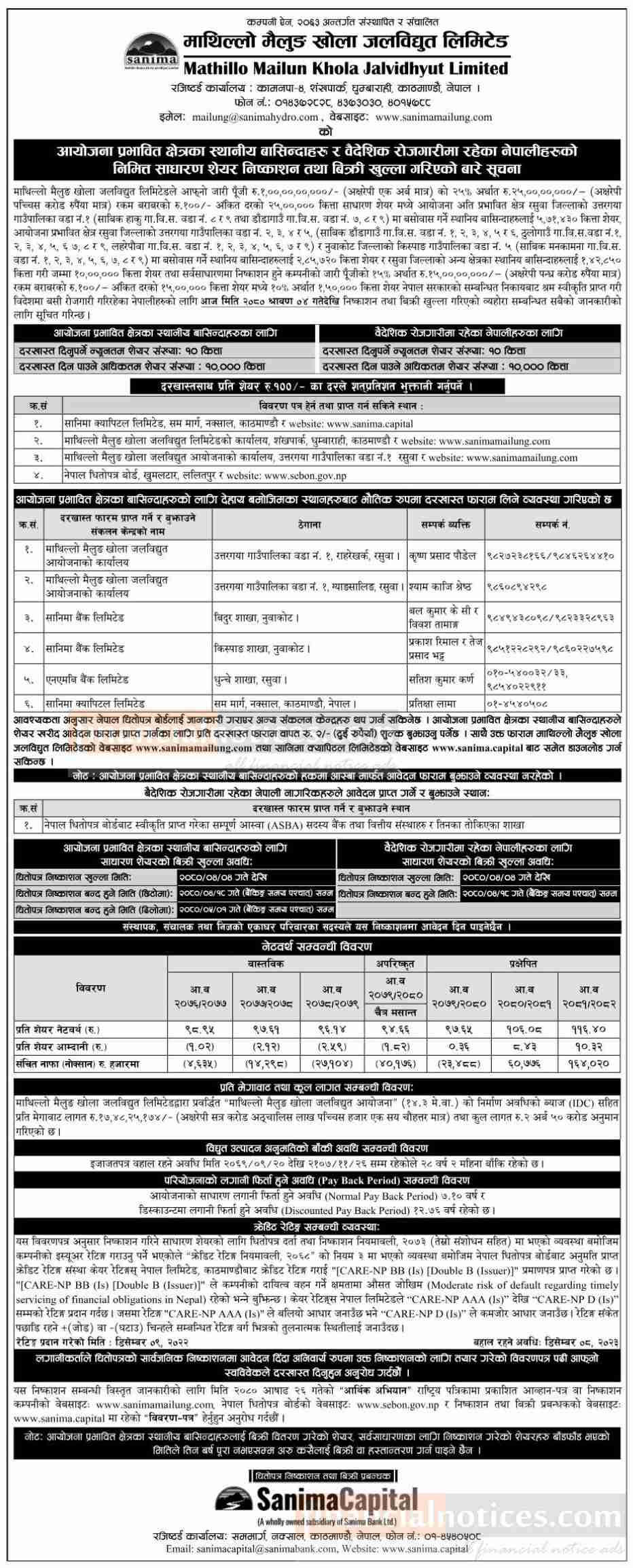 माथिल्लो मैलुङ खोला जलविद्युत लिमिटेडले आज अर्थात साउन ४ गतेदेखि आईपीओ निष्काशन तथा बिक्री खुला गर्ने सूचना प्रकाशित गरेको छ। कम्पनीले आयोजना प्रभावित क्षेत्रका स्थानिय बासिन्दा तथा वैदेशिक रोजगारीमा रहेका नेपालीहरुका लागि आईपीओ निष्काशन गर्न लागेको सूचनामा उल्लेख गरेको छ ।