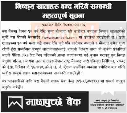 निष्कृय खाताहरु बन्द गरिने सम्बन्धी सूचना