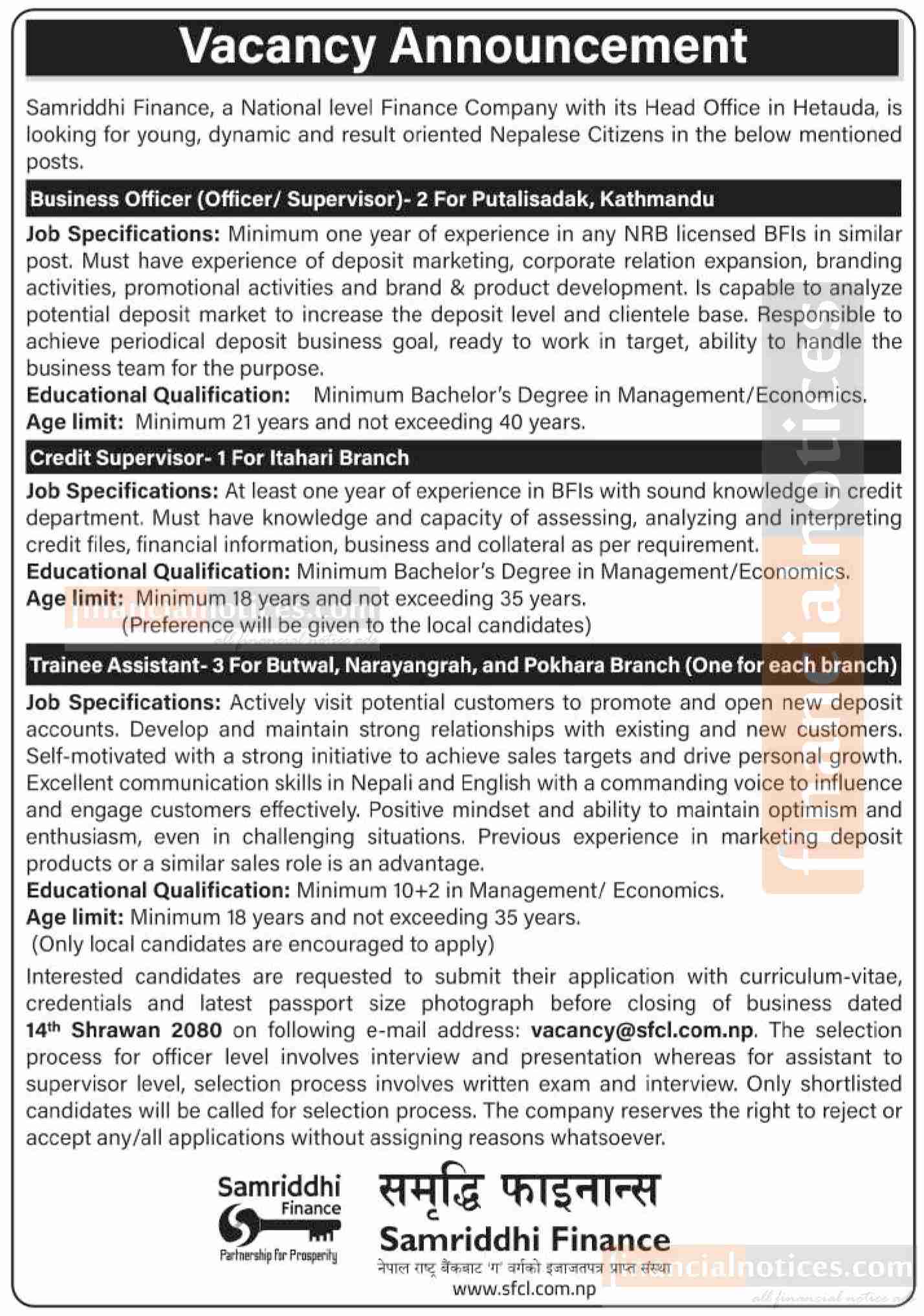 This is an excellent opportunity for young and enthusiastic individuals to be a part of Samriddhi Finance, a leading Finance Company in Nepal. The vacancies are expected to be filled quickly, so interested candidates are encouraged to apply promptly.