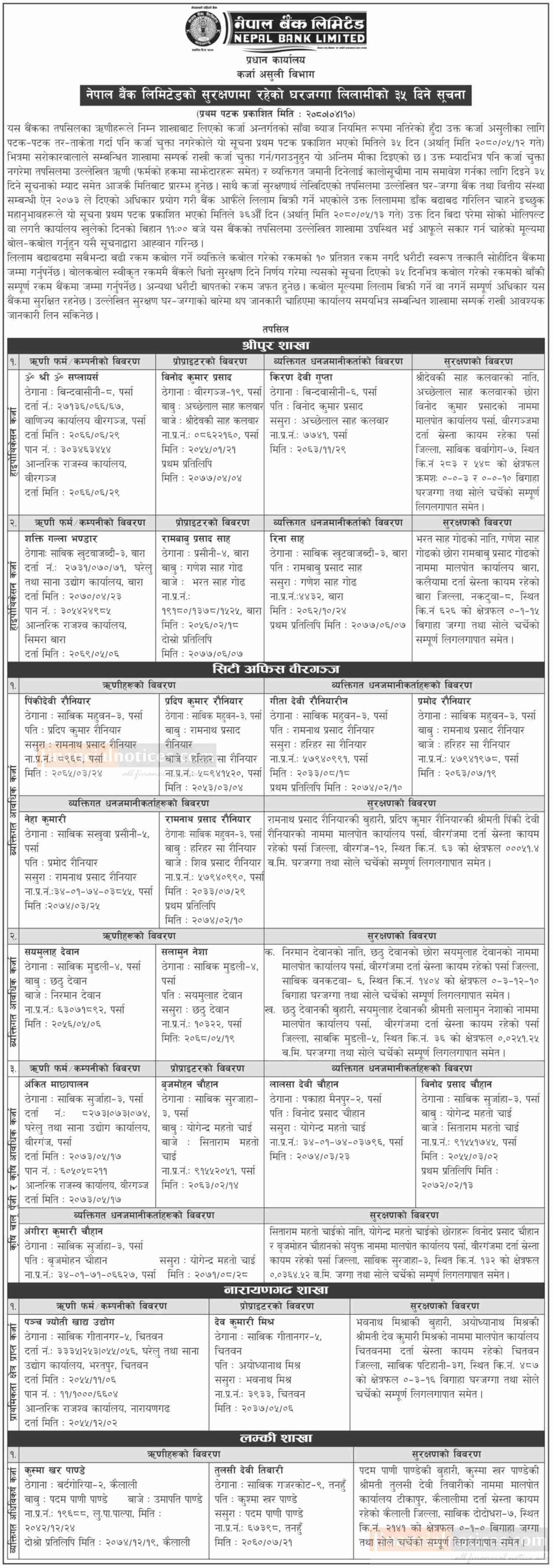 नेपाल बैंकको सुरक्षणमा रहेको घरजग्गा लिलामीको सूचना