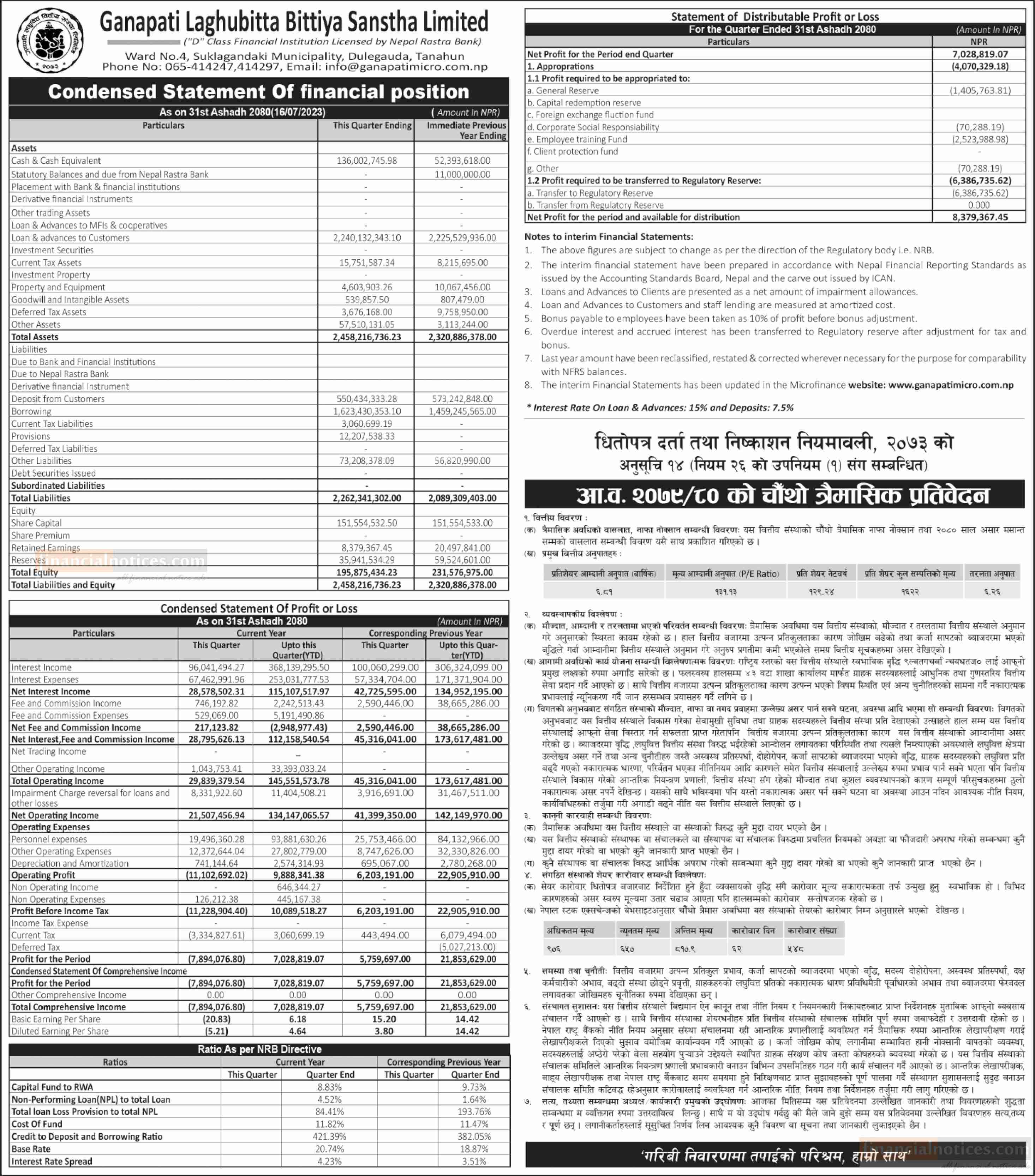 गणपति लघुवित्तको खुद नाफा ७० लाख २८ हजार रुपैयाँ - Q4 Report -