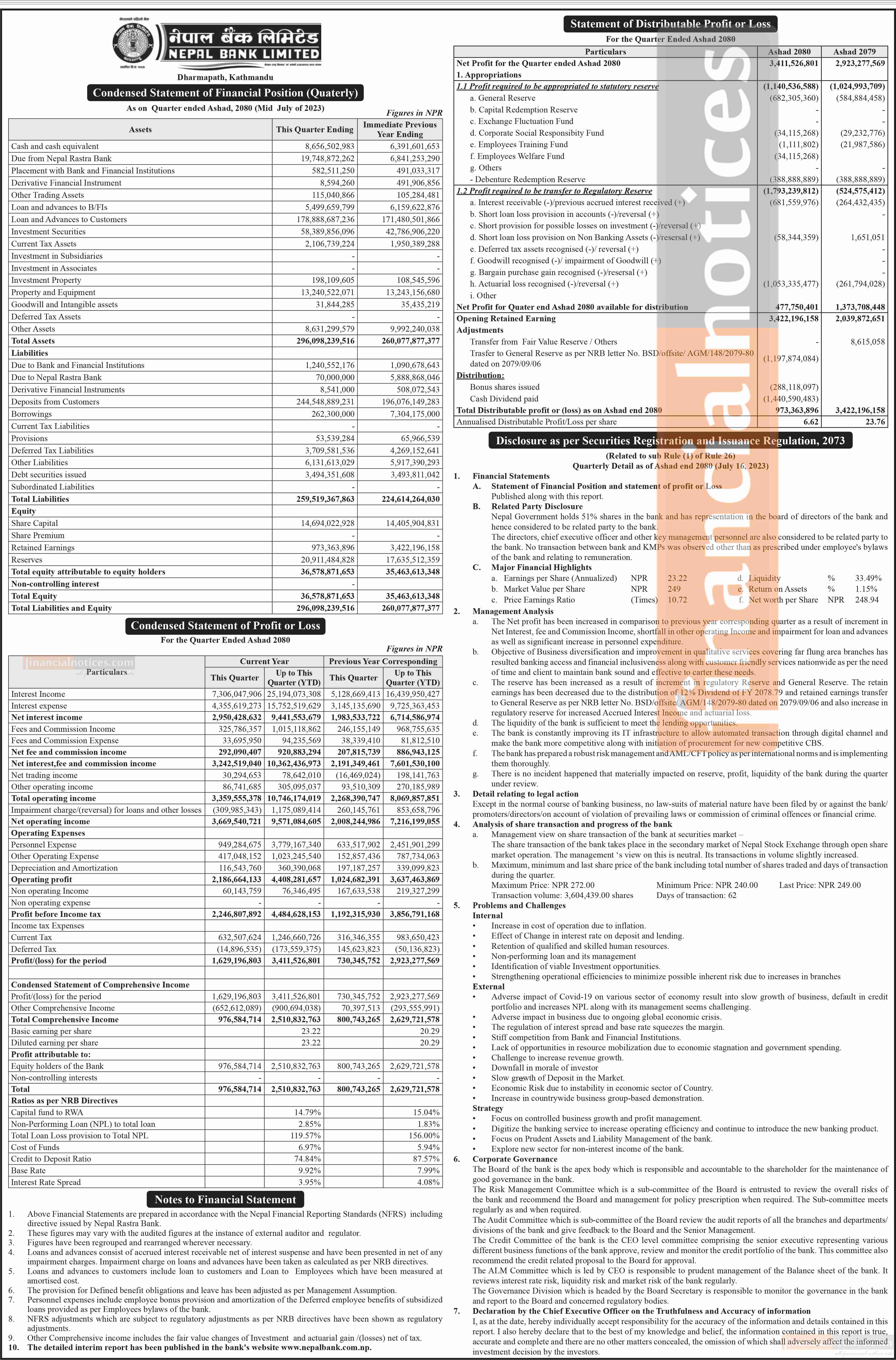नेपाल बैंकले गत आर्थिक वर्षको चौथो त्रैमाससम्मको अपरिष्कृत वित्तीय विवरण प्रकाशित गरेको छ। विवरण अनुसार बैंकले गत आर्थिक वर्षको असार मसान्तसम्ममा बैंकले ३ अर्ब ४१ करोड १५ लाख रुपैयाँ खुद नाफा कमाएको सूचना प्रकाशित गरेको छ। यो गत आर्थिक वर्षको सोही अवधिको तुलनामा १६.७० प्रतिशत बढी हो। अघिल्लो आर्थिक वर्षको सोही अवधिसम्ममा बैंकले २ अर्ब ९२ करोड ३२ लाख रुपैयाँ खुद नाफा कमाएको थियो।