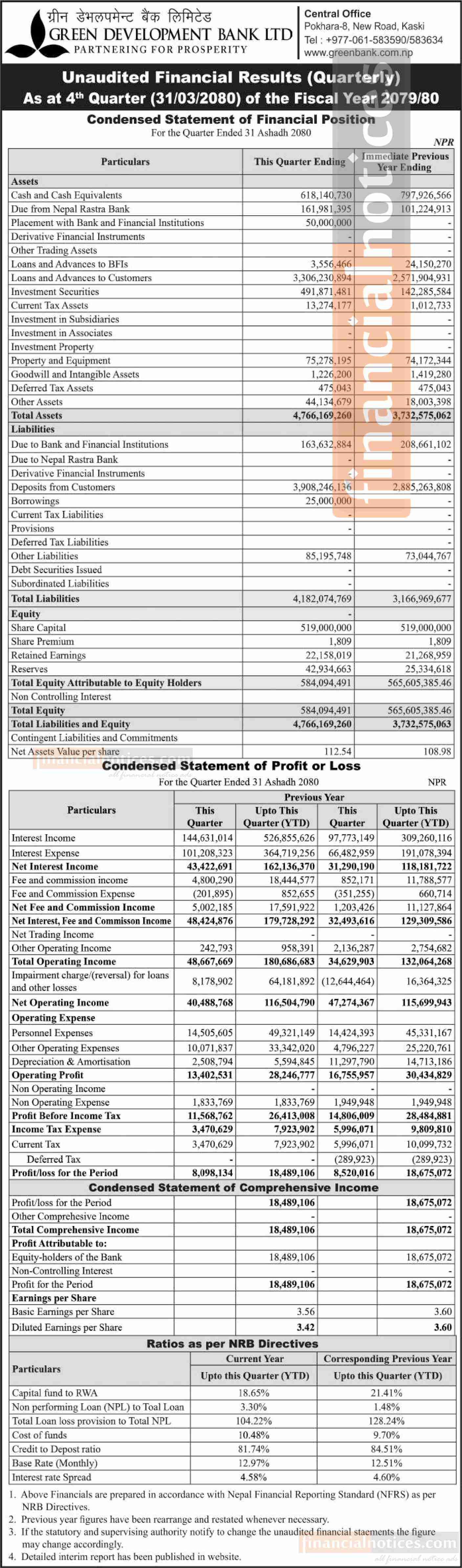 Green Development Bank Limited recorded a net profit of Rs 18.48 million in the 4th quarter of fiscal year 2079/80.