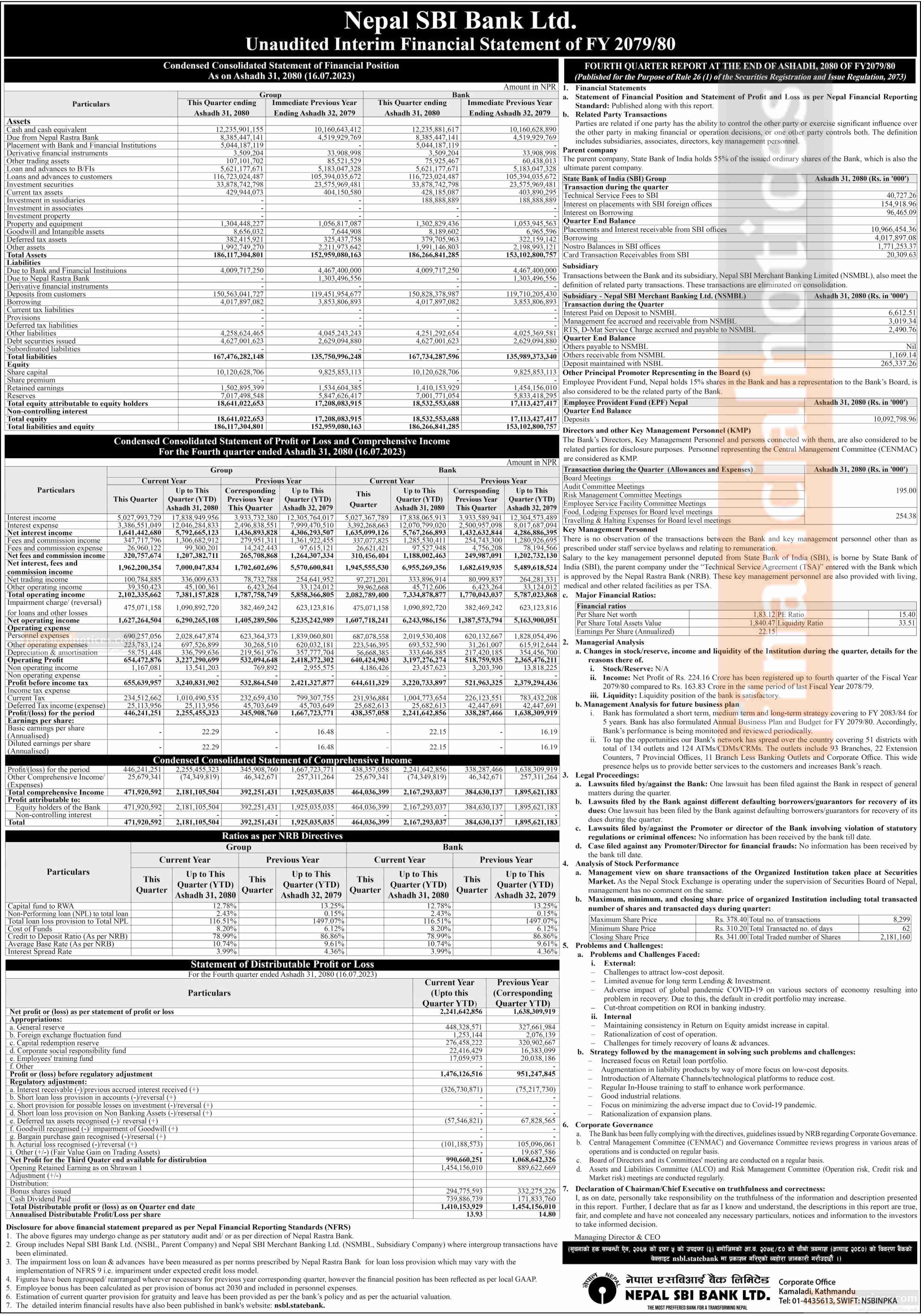 नेपाल एसबीआई बैंक लिमिटेडले गत आर्थिक वर्षको चौथो त्रैमाससम्मको अपरिष्कृत वित्तीय विवरण प्रकाशित गरेको छ। विवरण अनुसार बैंकले गत आर्थिक वर्षको असार मसान्तसम्ममा २ अर्ब २४ करोड १६ लाख रुपैयाँ खुद नाफा कमाएको छ। अघिल्लो आर्थिक वर्षको सोही अवधिसम्ममा बैंकले १ अर्ब ६३ करोड ८३ लाख रुपैयाँ खुद नाफा कमाएको थियो।