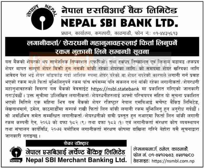 शेयरधनीहरुलाई फिर्ता लिनुपर्ने रकम भुक्तानी लिने सम्बन्धी सूचना