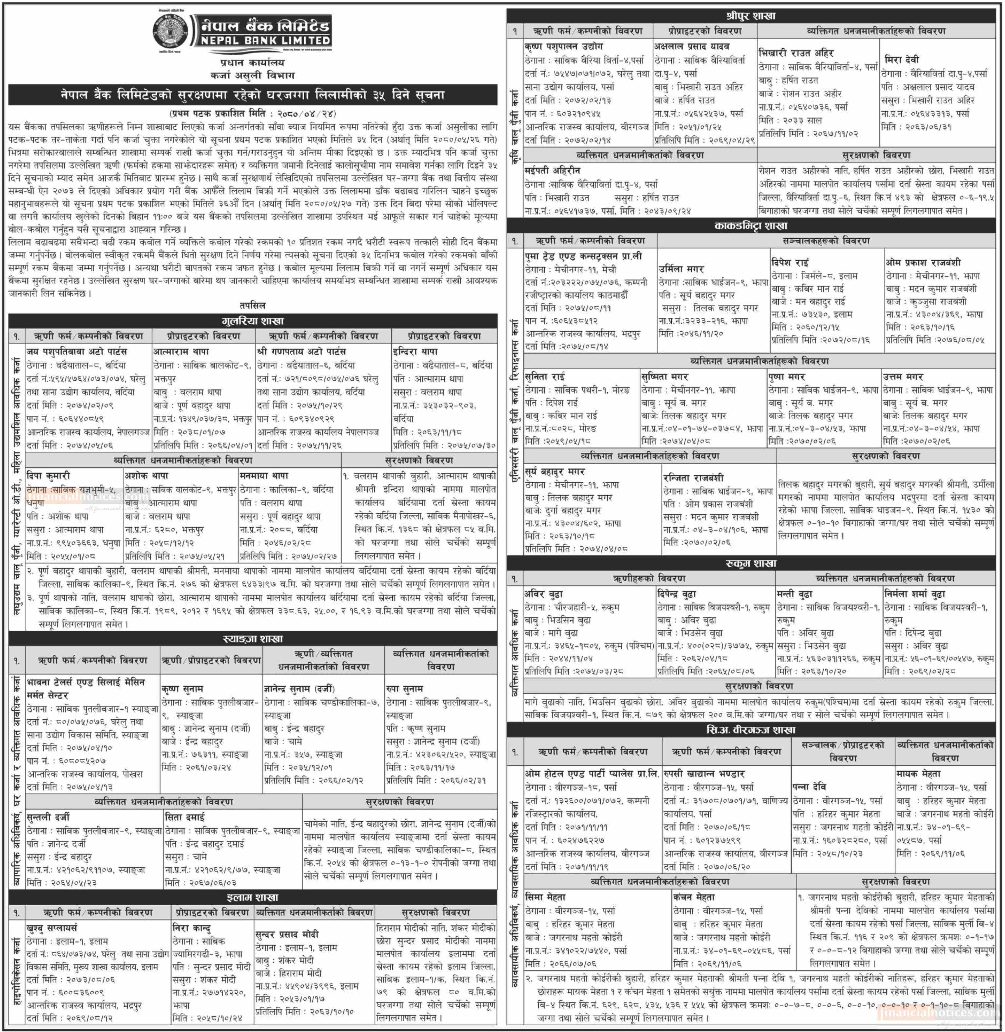 नेपाल बैंकको सुरक्षणमा रहेको घरजग्गा लिलामीको ३५ दिने सूचना